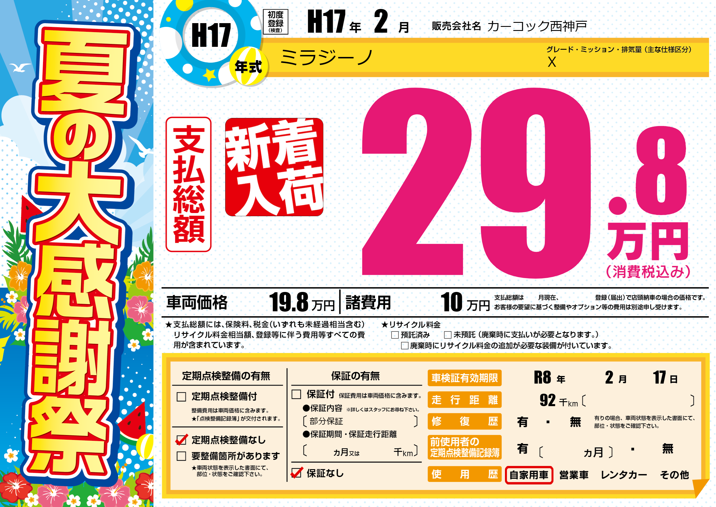 | 走行キロ | 9.2万km | 初年度登録 | H17年2月 |