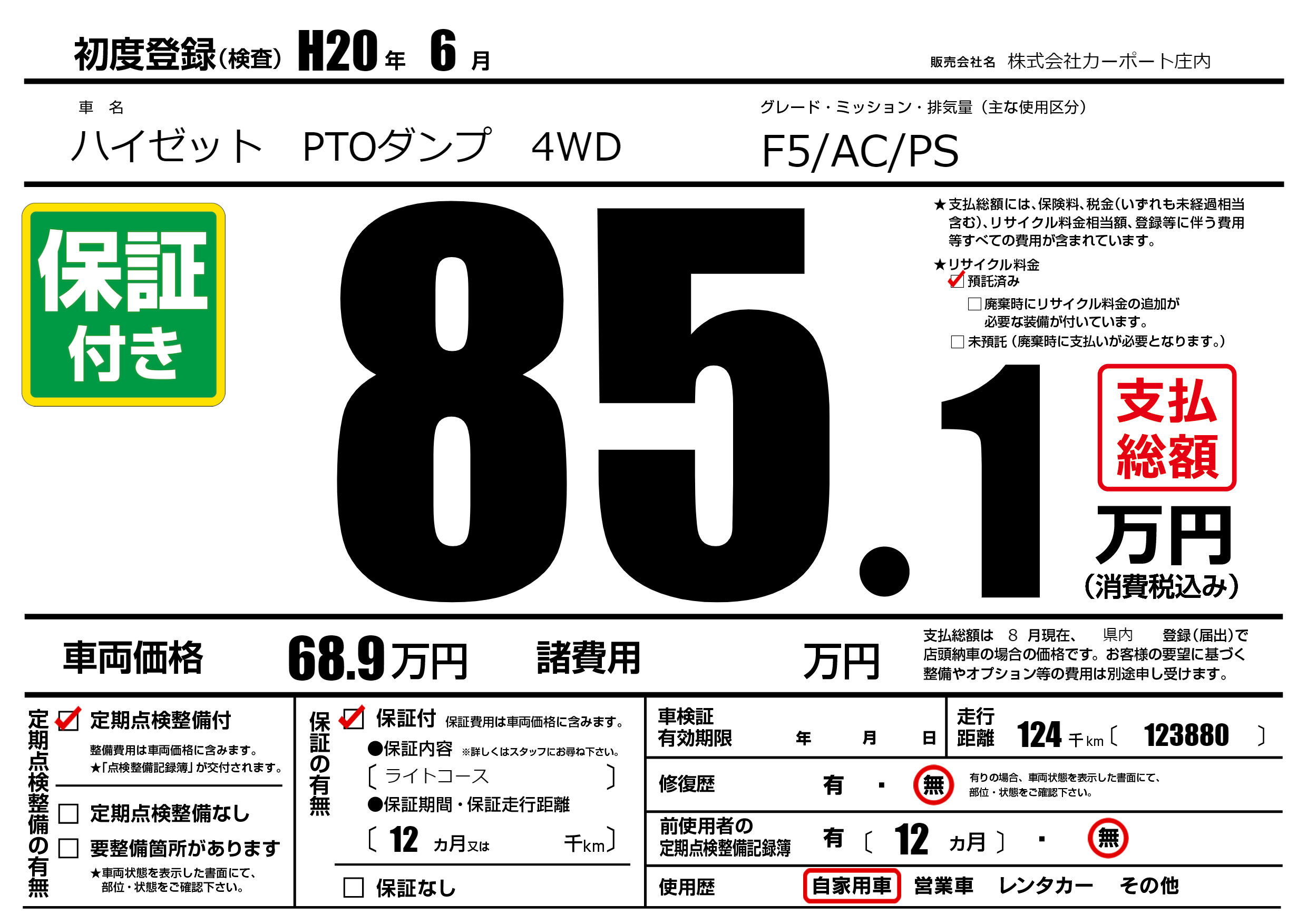 | 車名 | ハイゼット PTOダンプ 4WD | グレード ミッション 排気量 |