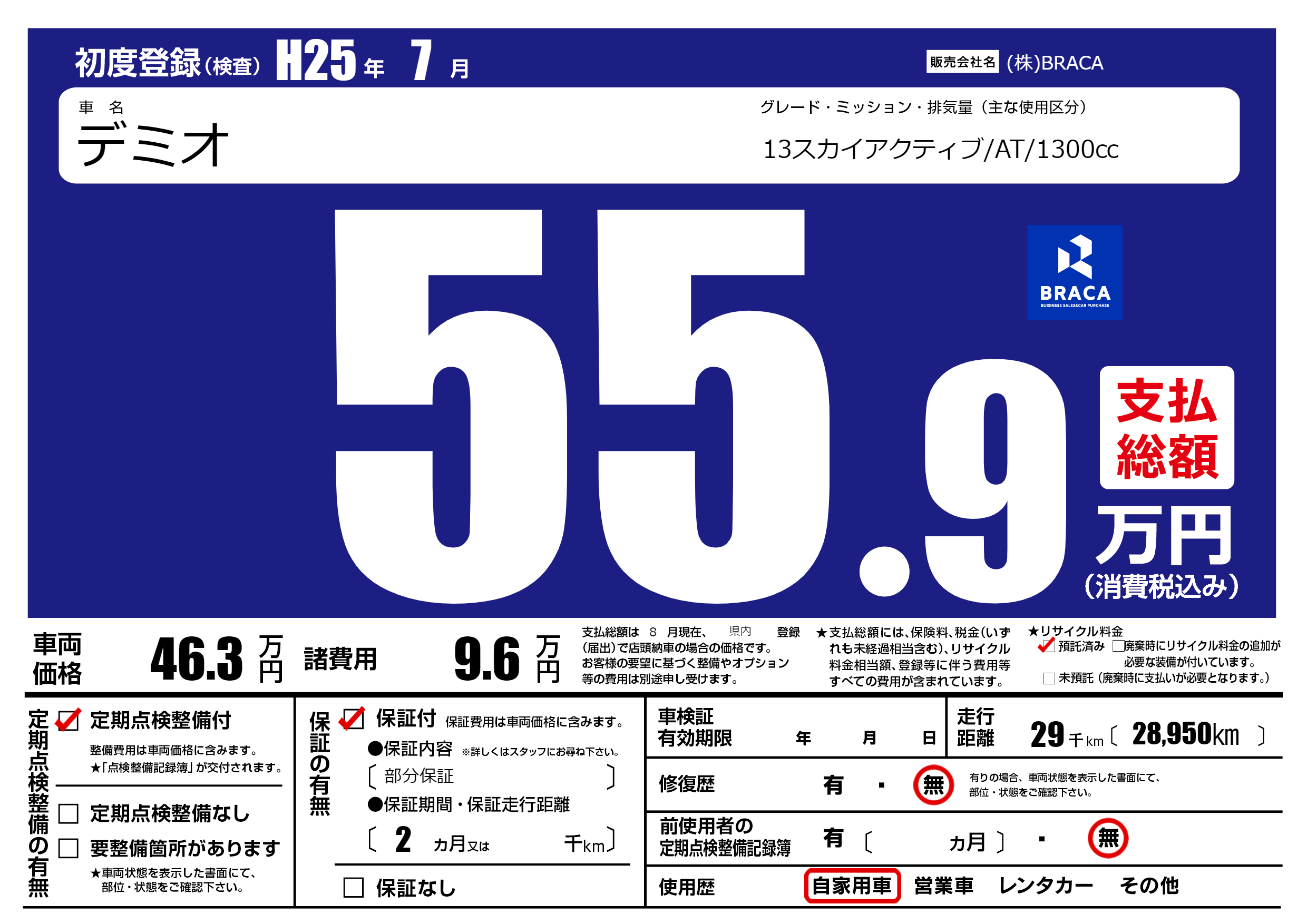 | 走行キロ | 2.9万km | 初年度登録 | H25年7月 |