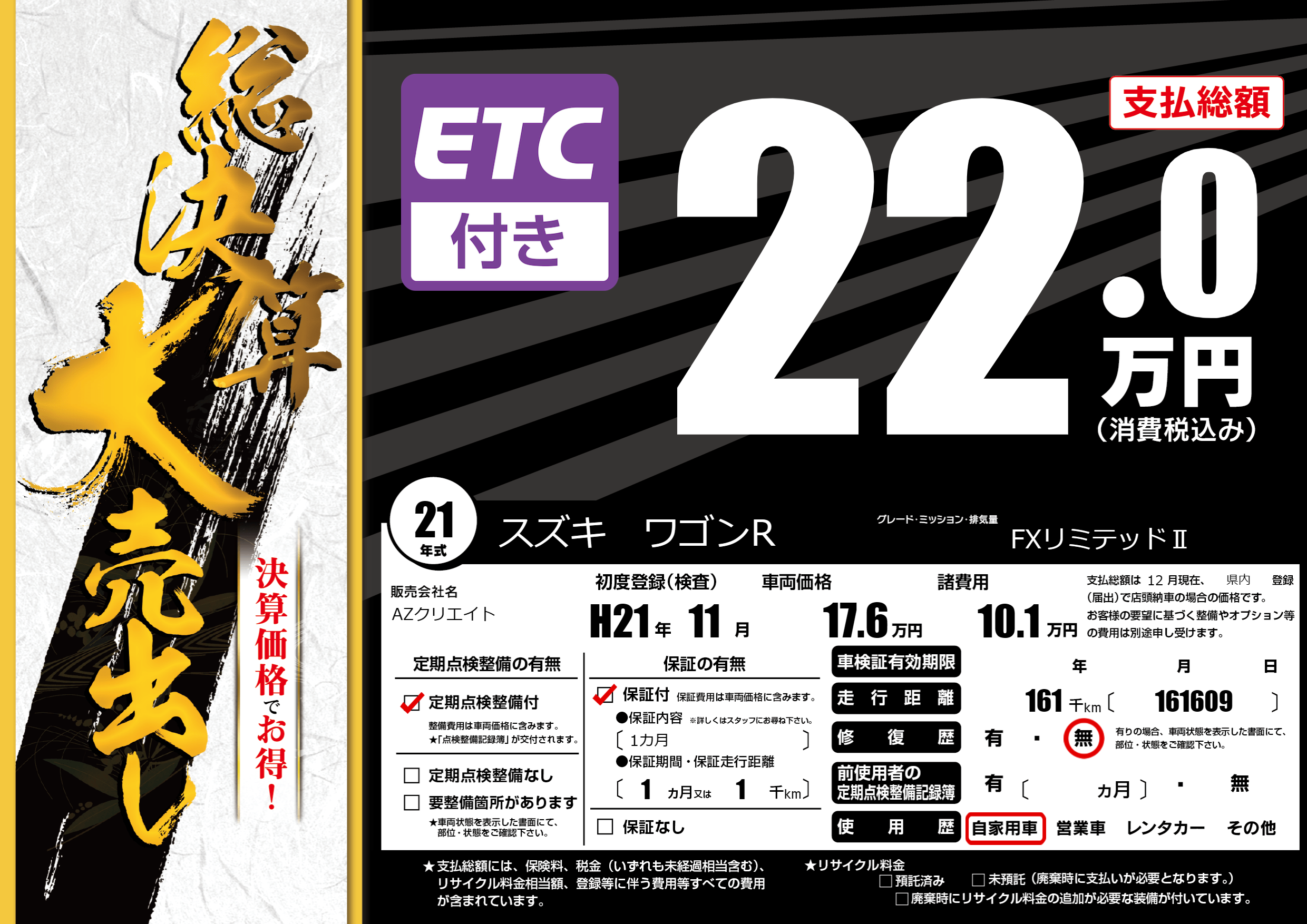 | 走行キロ | 16.1万km | 初年度登録 | H21年11月 |