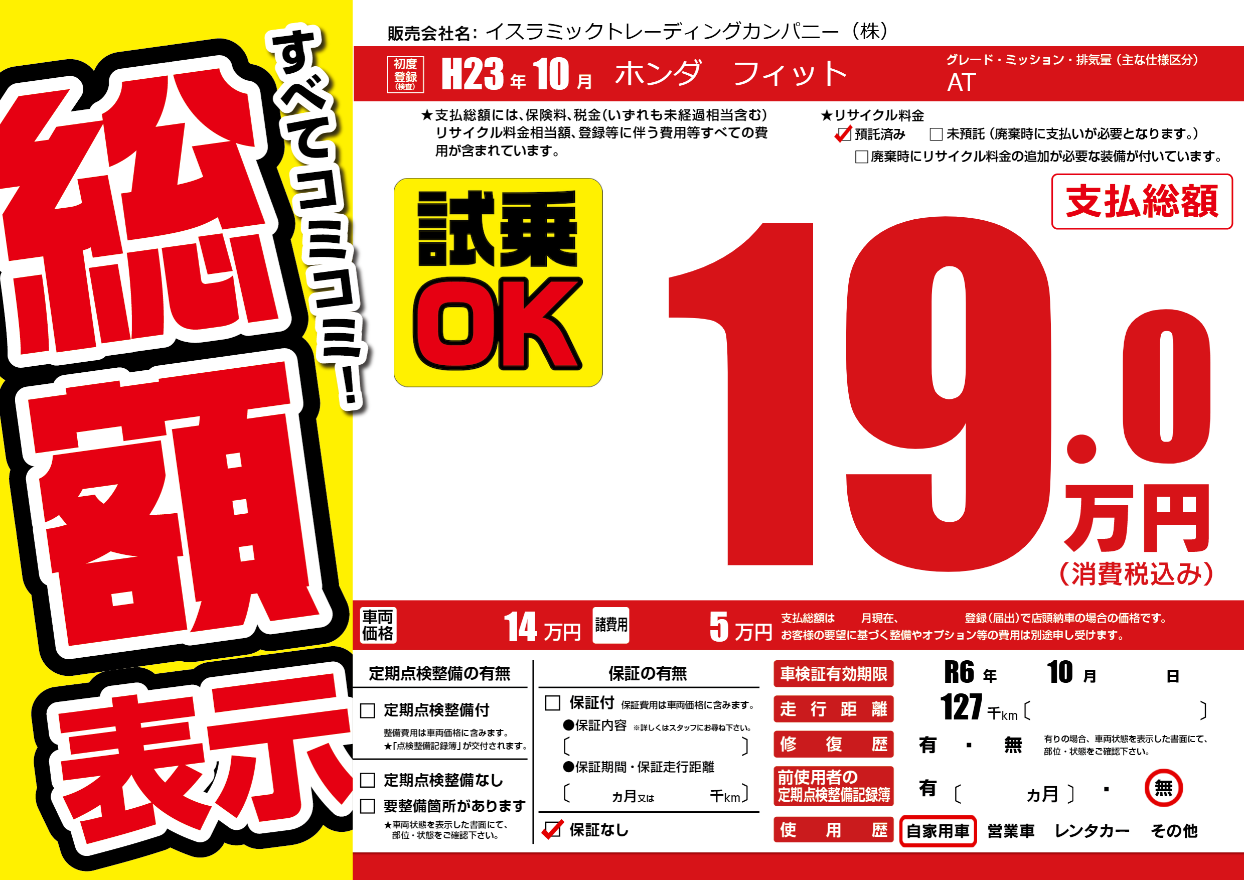 | 走行キロ | 12.7万km | 初年度登録 | H23年10月 |
