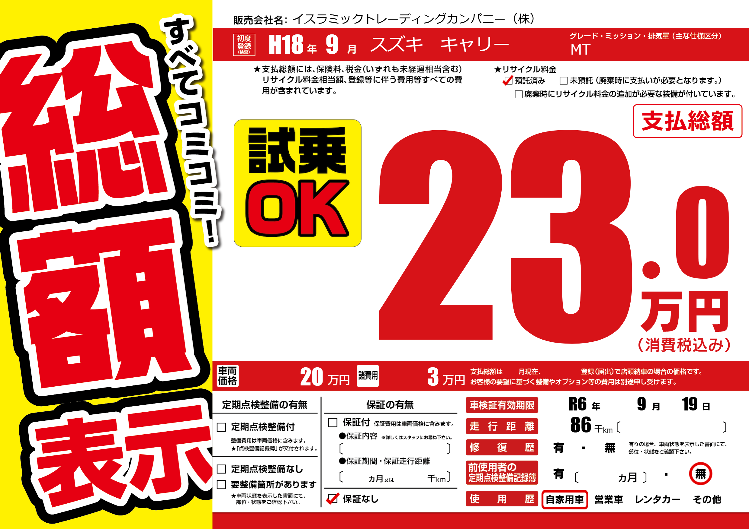 | 走行キロ | 8.6万km | 初年度登録 | H18年9月 |