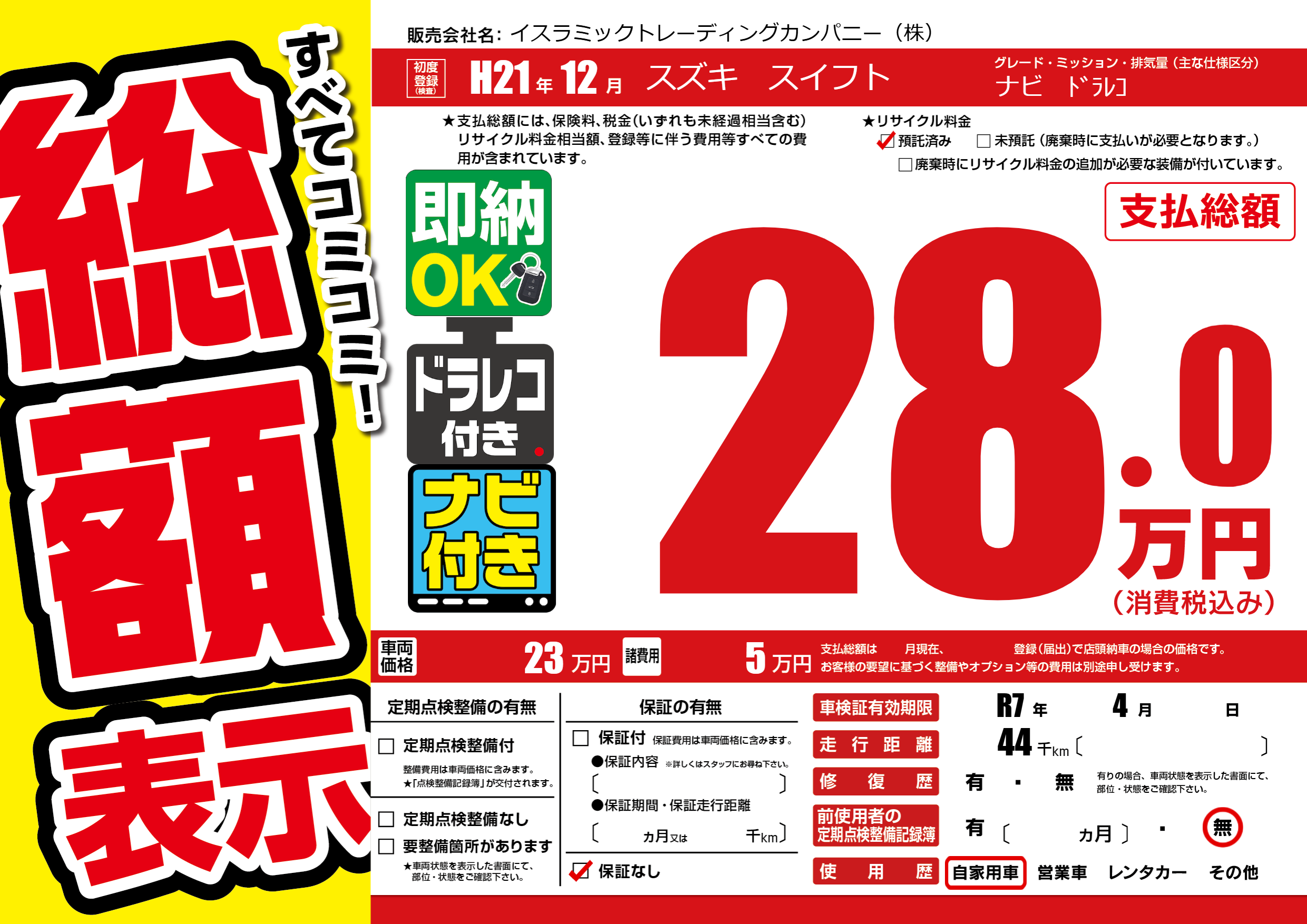 | 車名 | スズキ スイフト | グレード ミッション 排気量 |