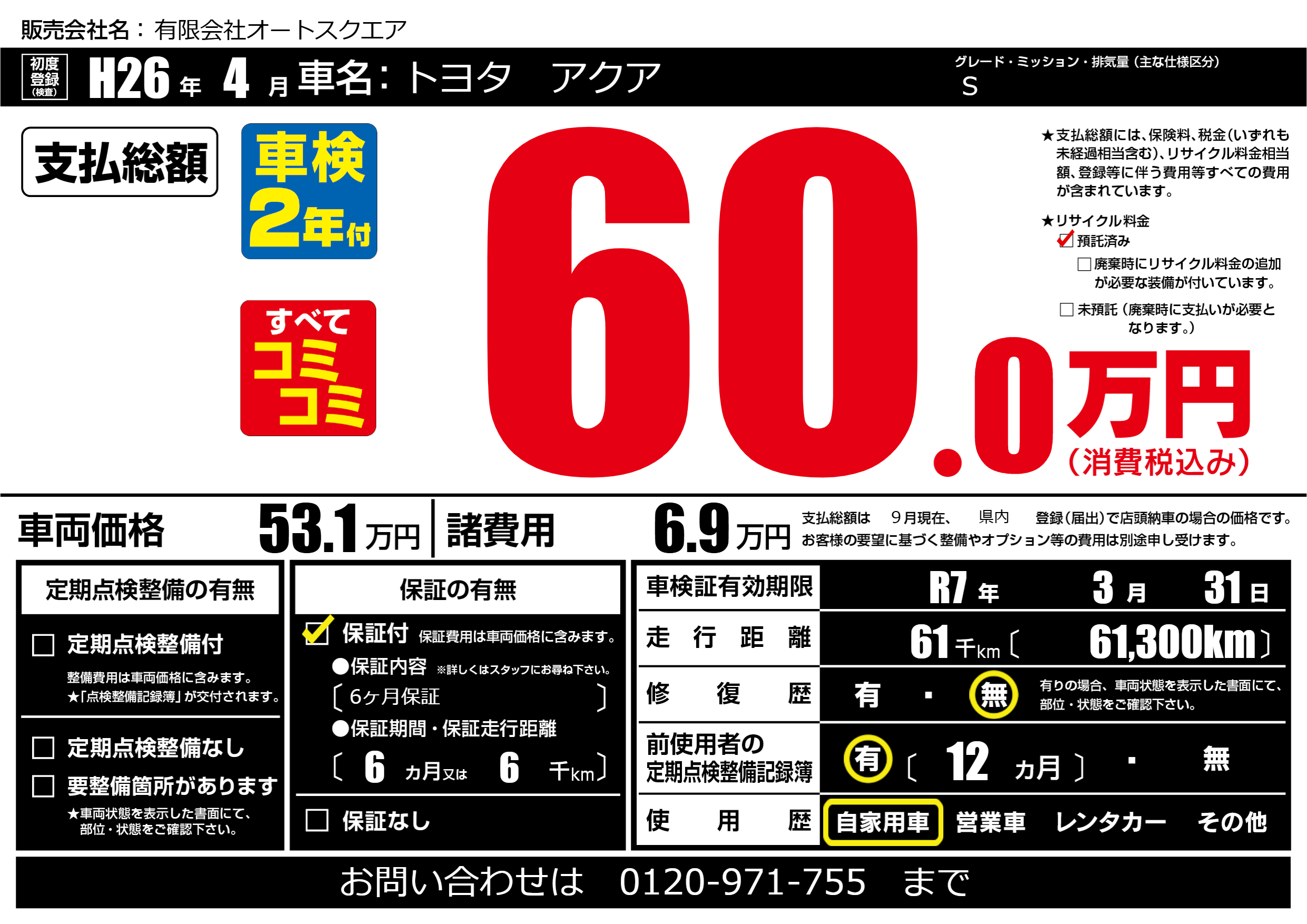 | 走行キロ | 6.1万km | 初年度登録 | H26年4月 |
