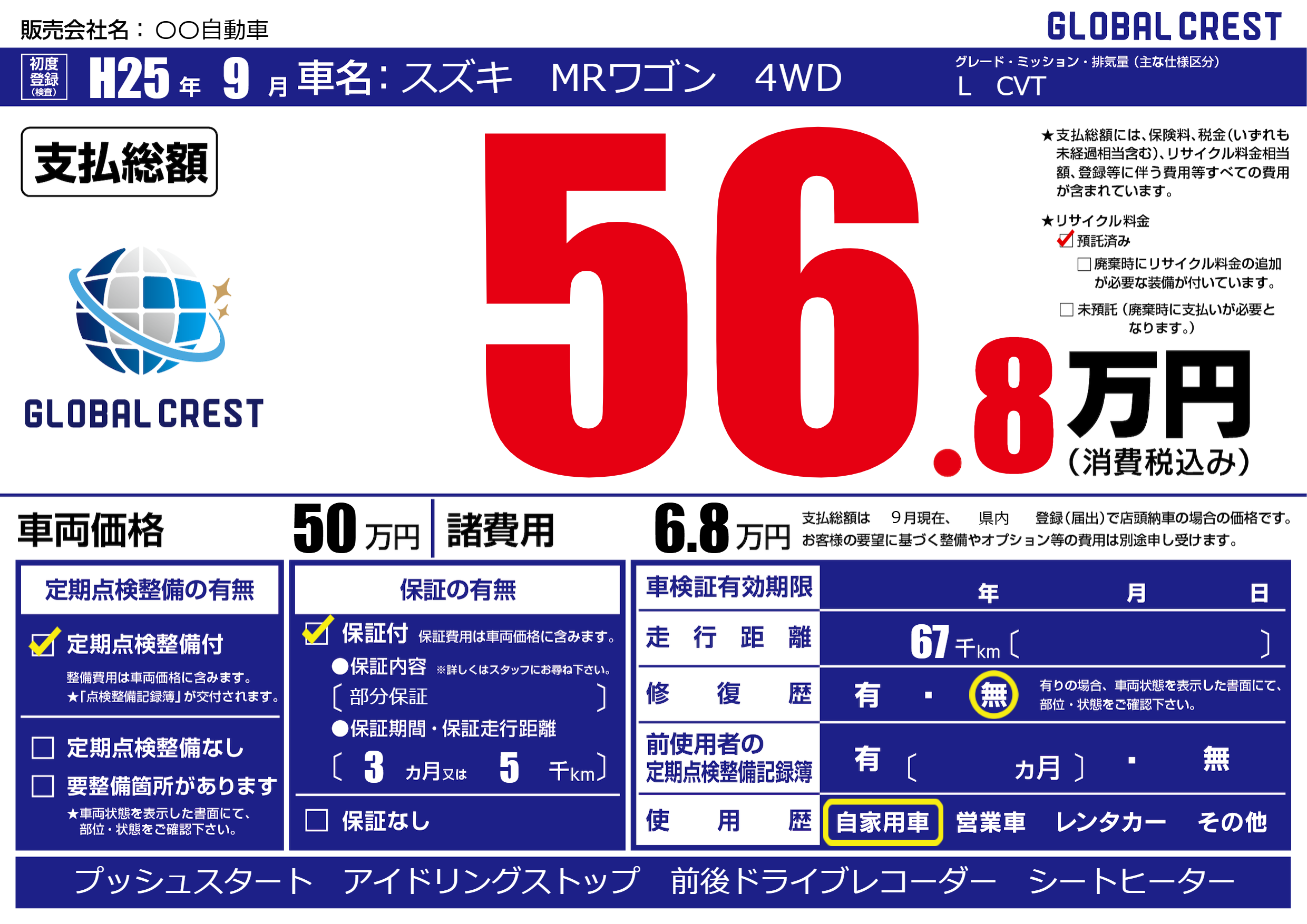 | 車名 | スズキ MRワゴン 4WD | グレード ミッション 排気量 |