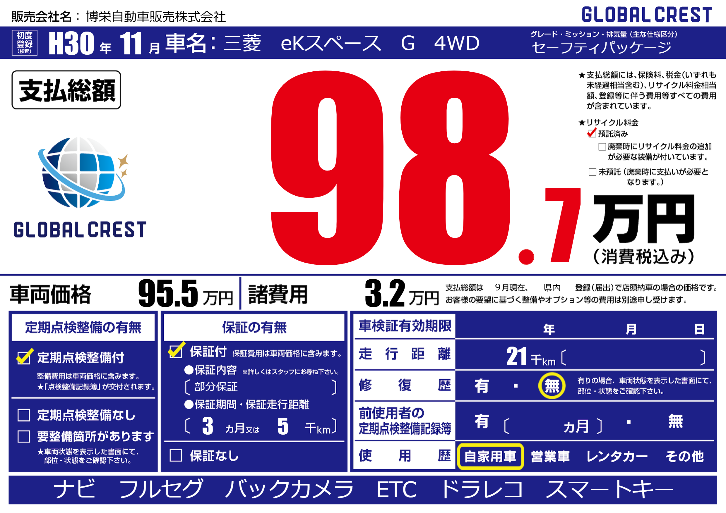 | 車名 | 三菱 eKスペース G 4WD | グレード ミッション 排気量 |