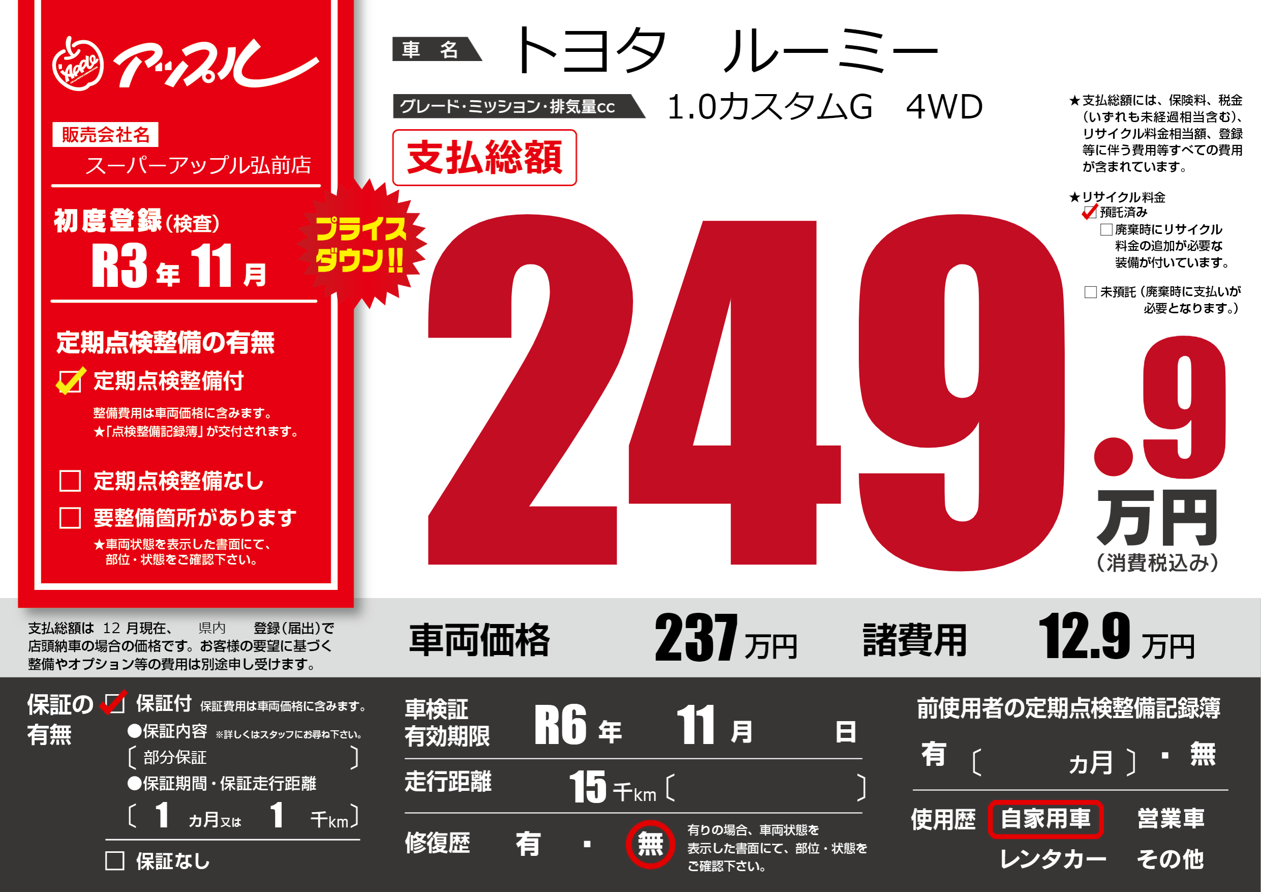 | 車名 | トヨタ ルーミー | グレード ミッション 排気量 |