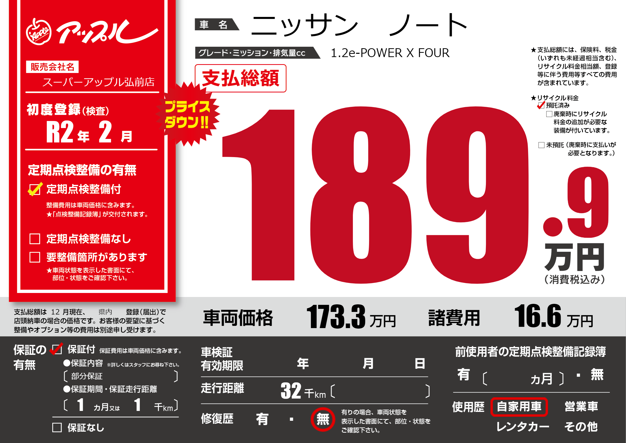 | 車名 | ニッサン ノート | グレード ミッション 排気量 |
