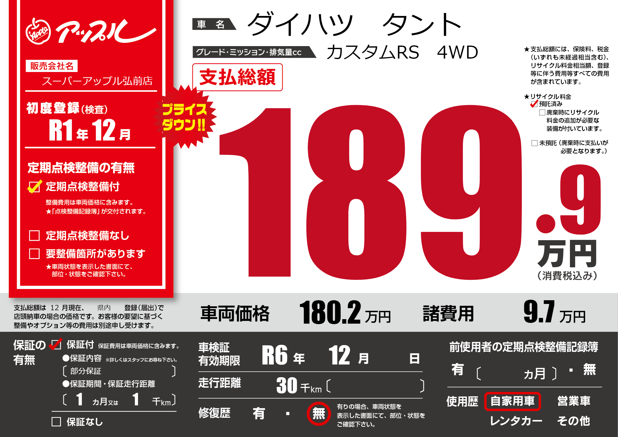| 車名 | ダイハツ タント | グレード ミッション 排気量 |