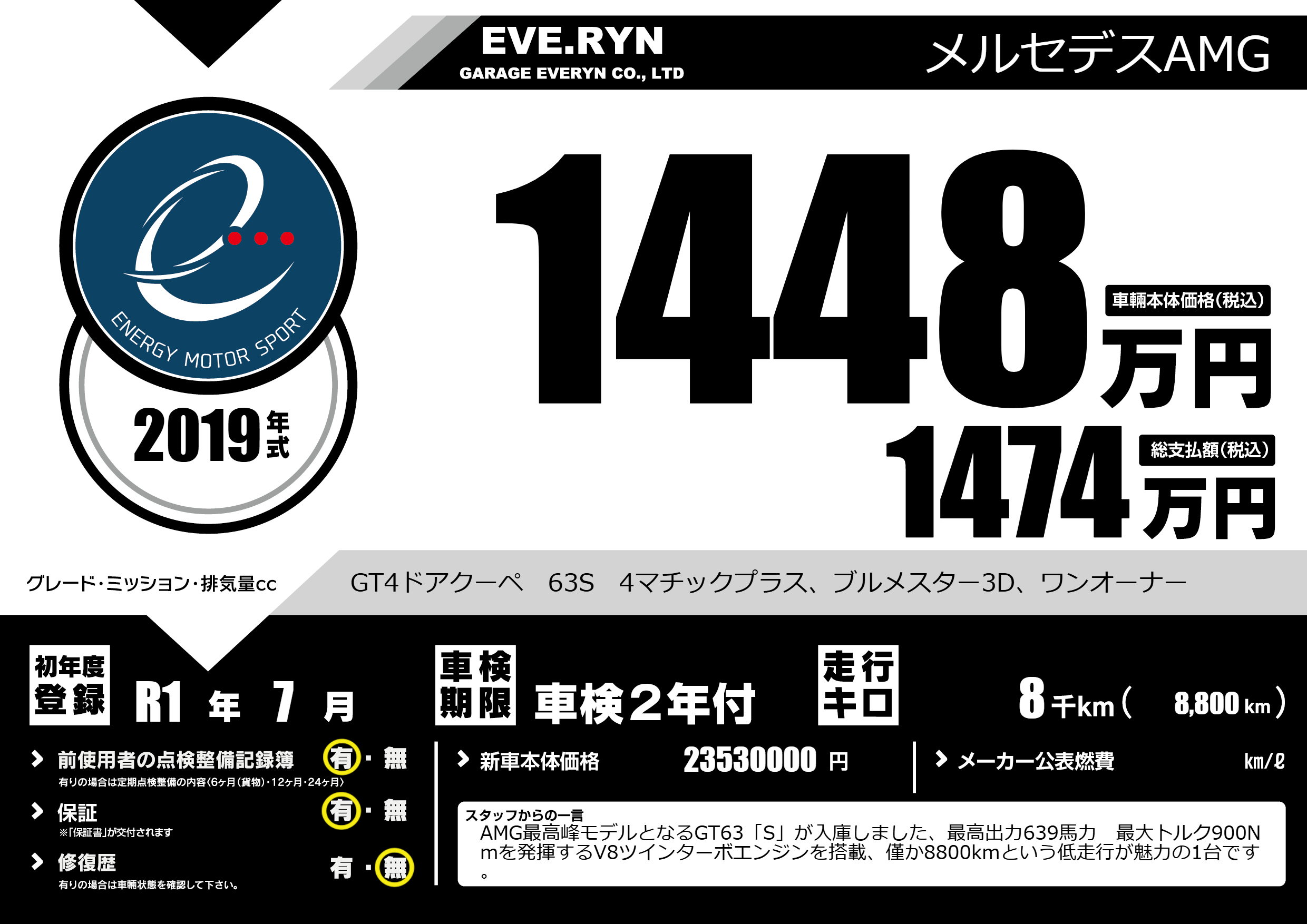 | 走行キロ | 0.8万km | 初年度登録 | R1年7月 |