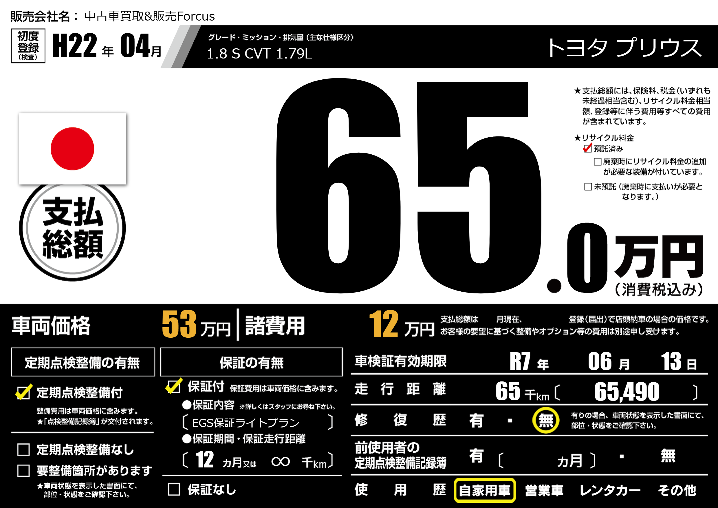 | 走行キロ | 6.5万km | 初年度登録 | H22年04月 |