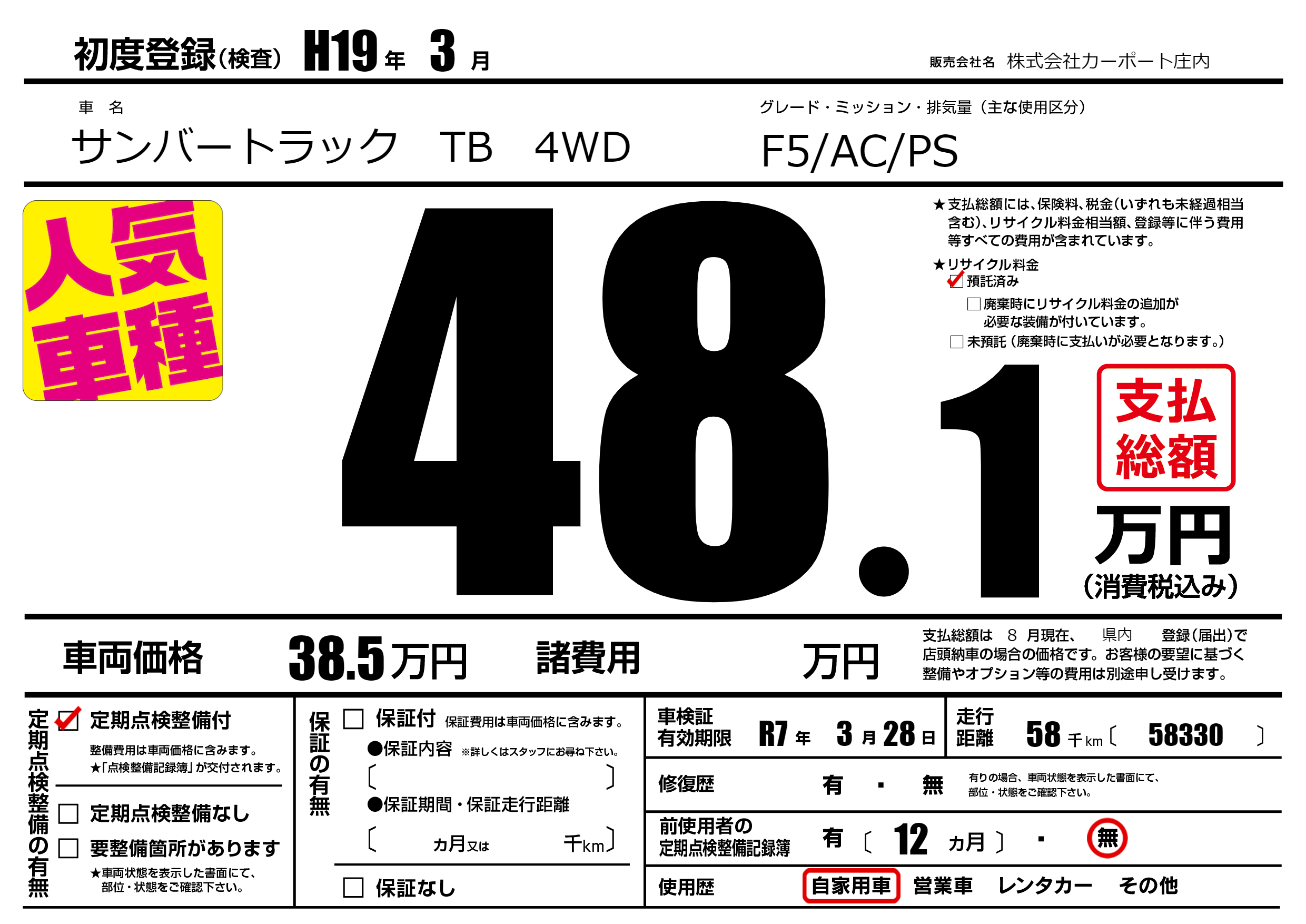 | 車名 | サンバートラック TB 4WD | グレード ミッション 排気量 |
