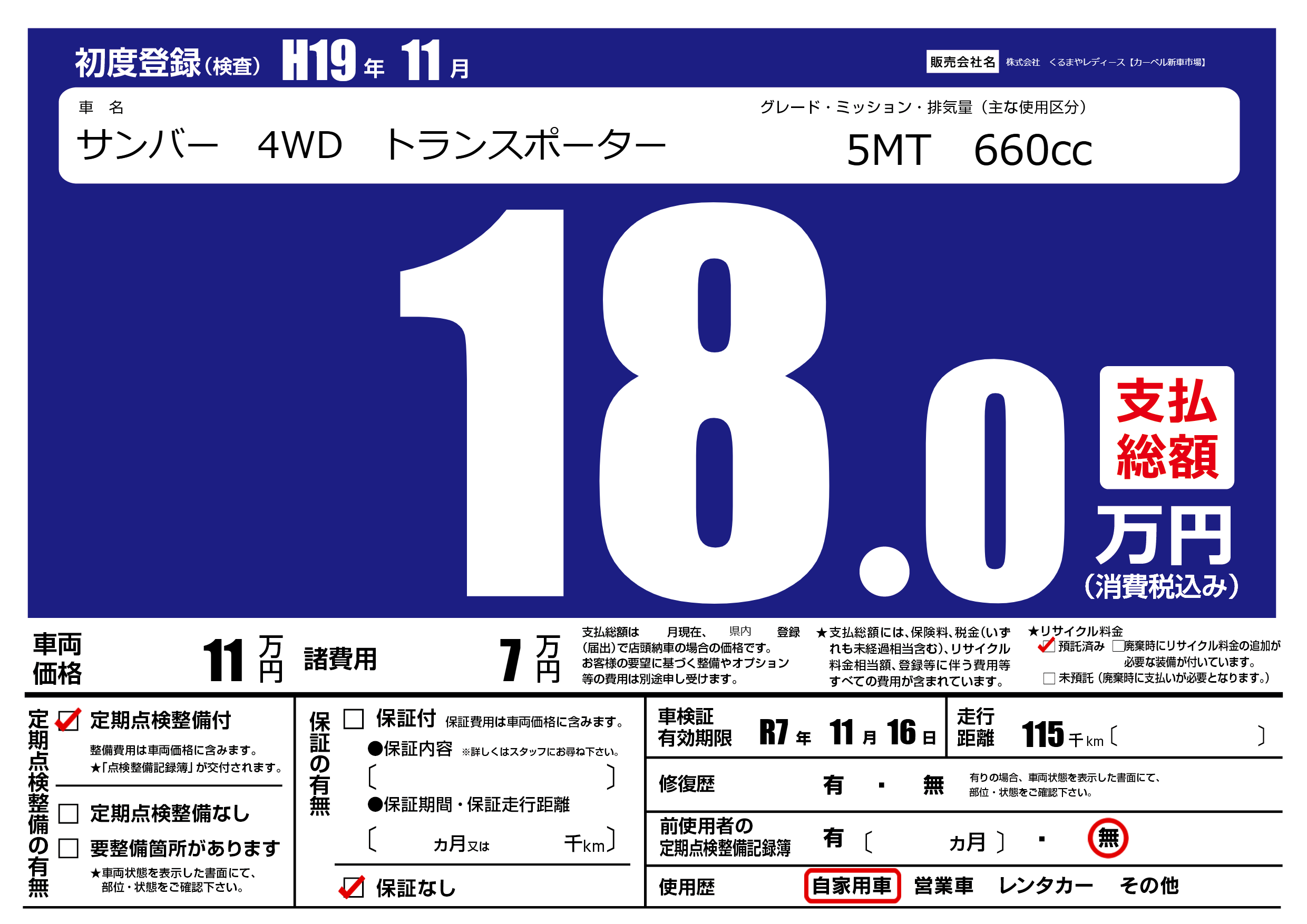 | 走行キロ | 11.5万km | 初年度登録 | H19年11月 |