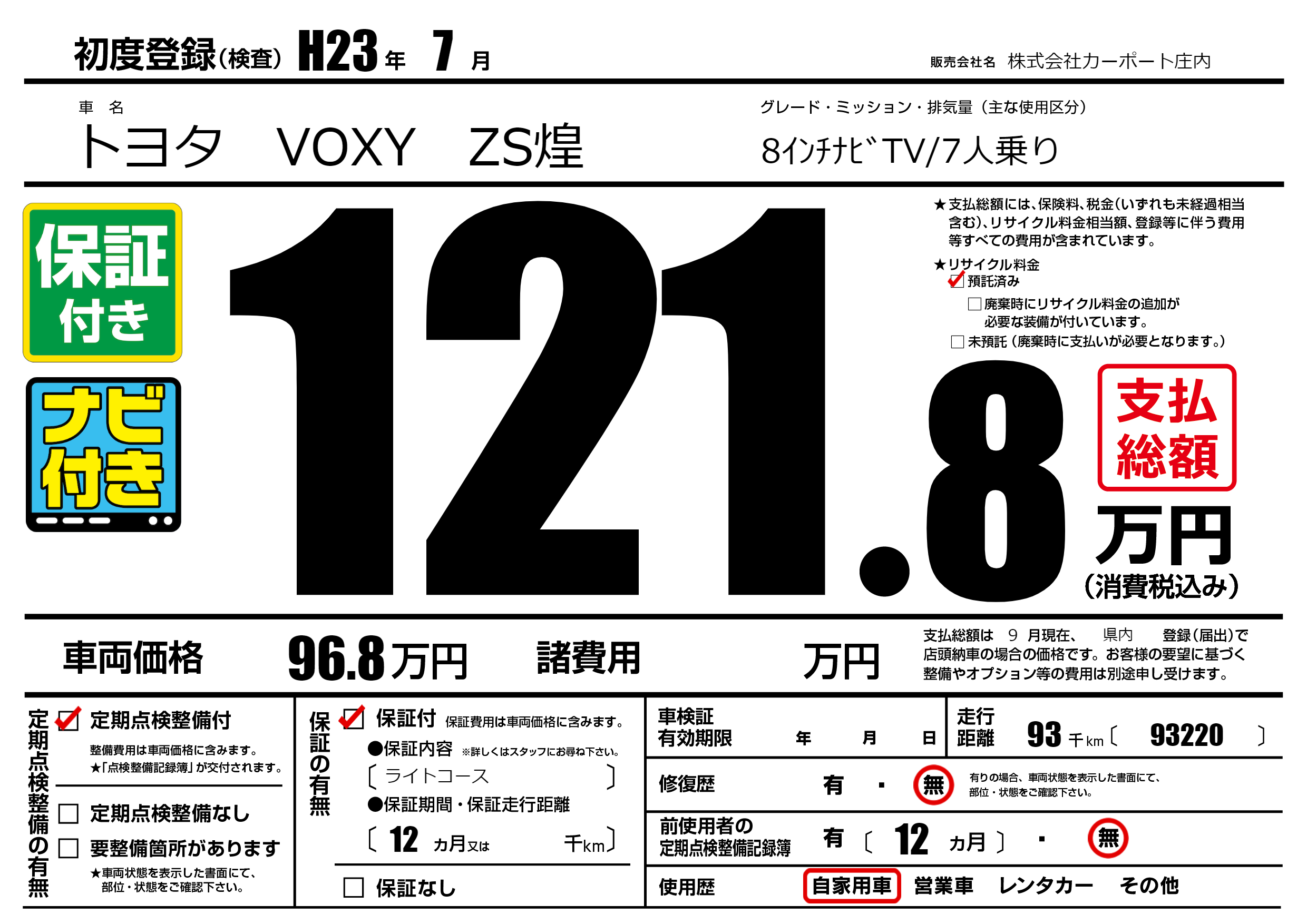 | 走行キロ | 9.3万km | 初年度登録 | H23年7月 |