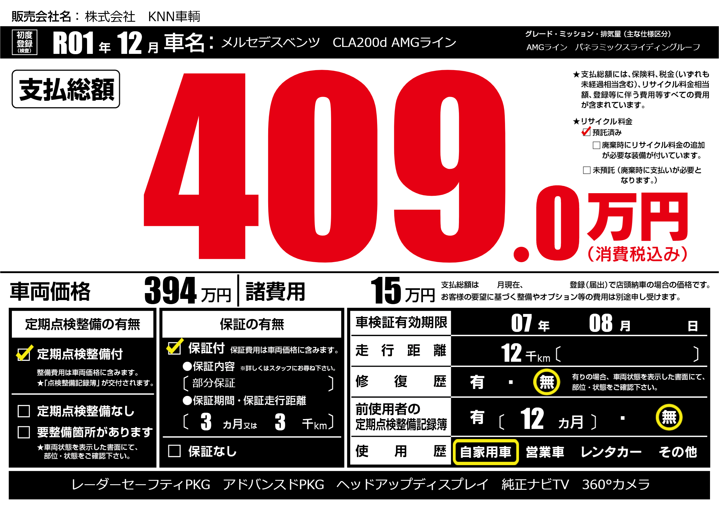 | 車名 | メルセデスベンツ CLA200d AMGライン | グレード ミッション 排気量 |