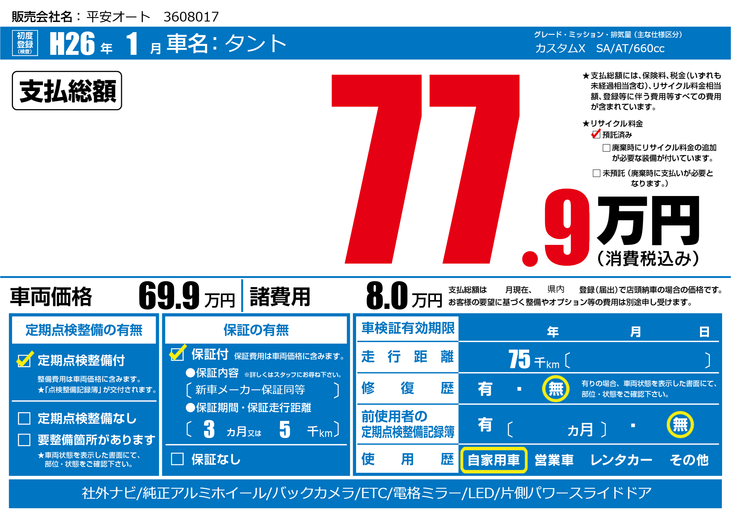 | 走行キロ | 7.5万km | 初年度登録 | H26年1月 |