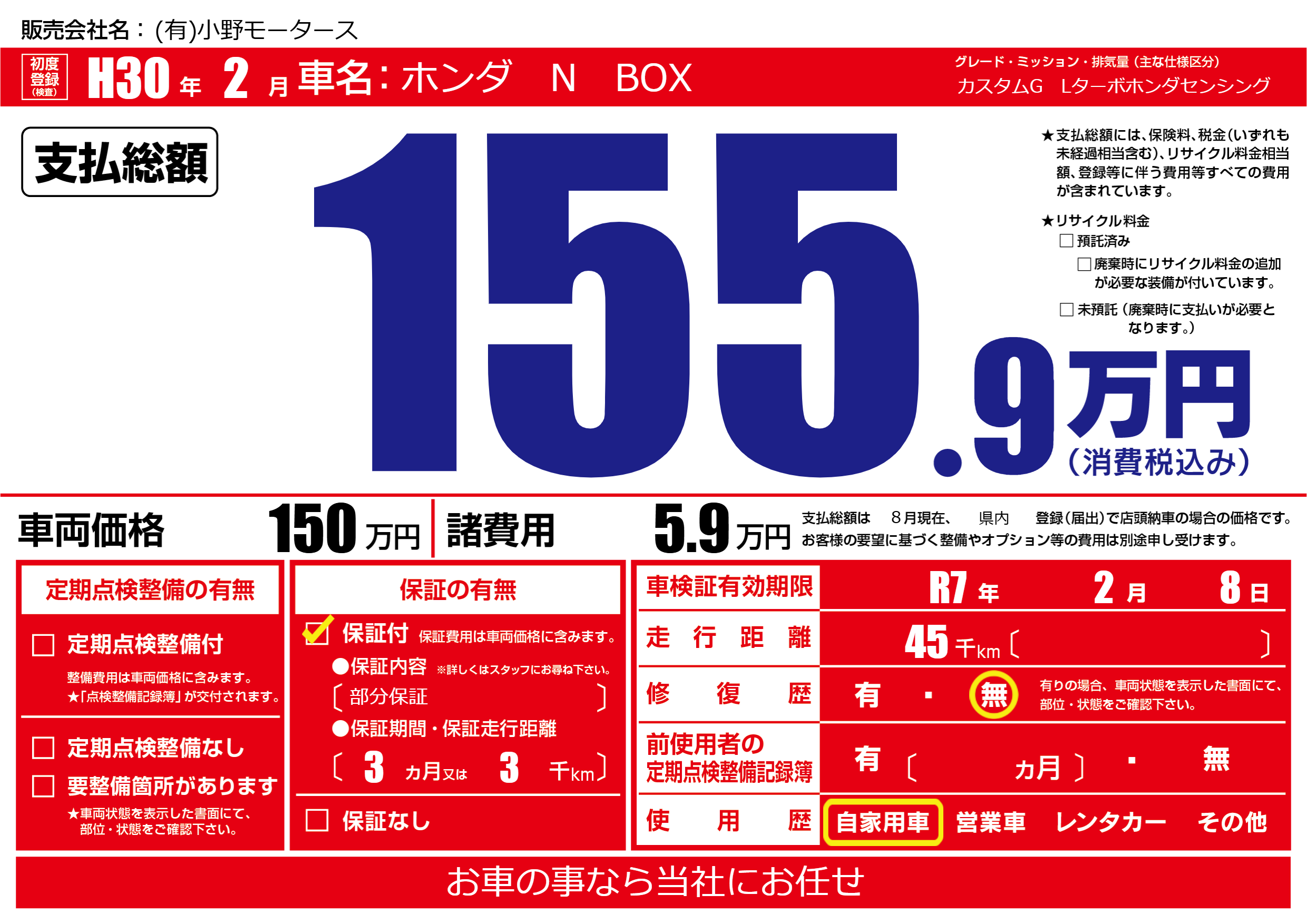 | 車名 | ホンダ N BOX | グレード ミッション 排気量 |