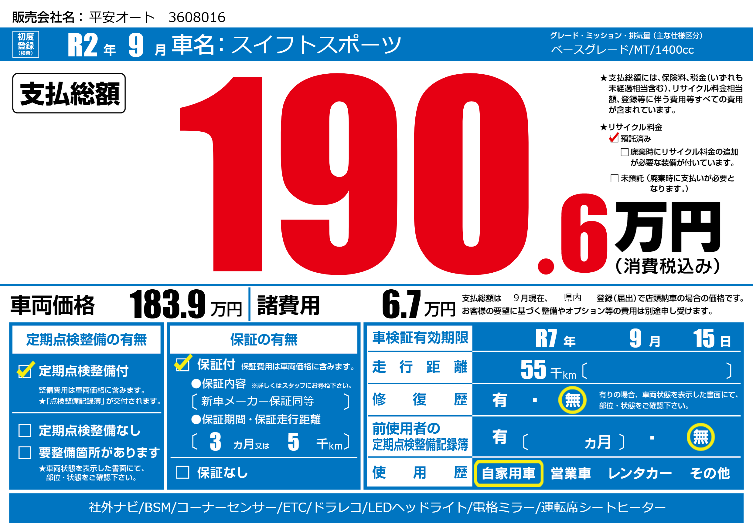 | 車名 | スイフトスポーツ | グレード ミッション 排気量 |