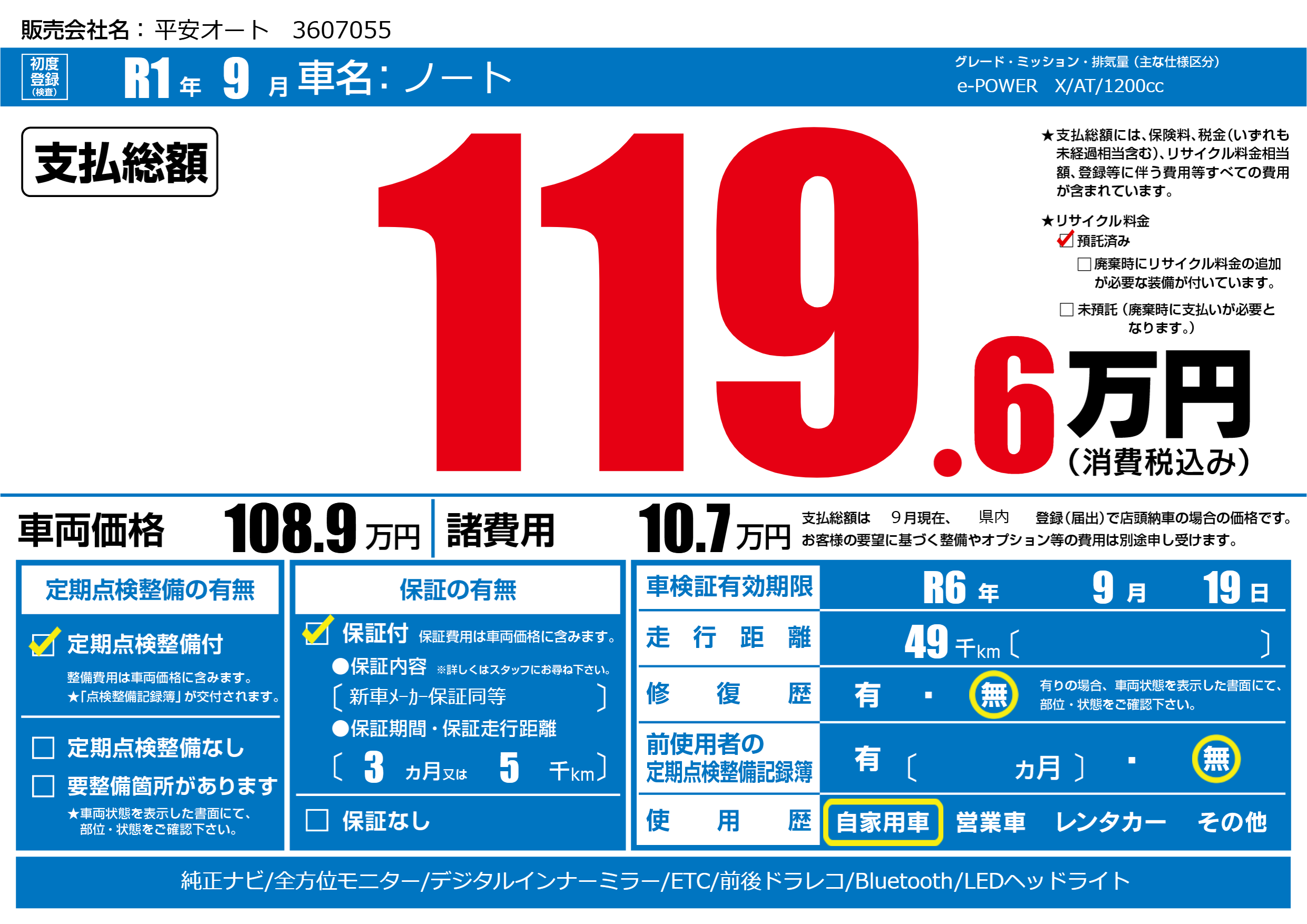 | 走行キロ | 4.9万km | 初年度登録 | R1年9月 |