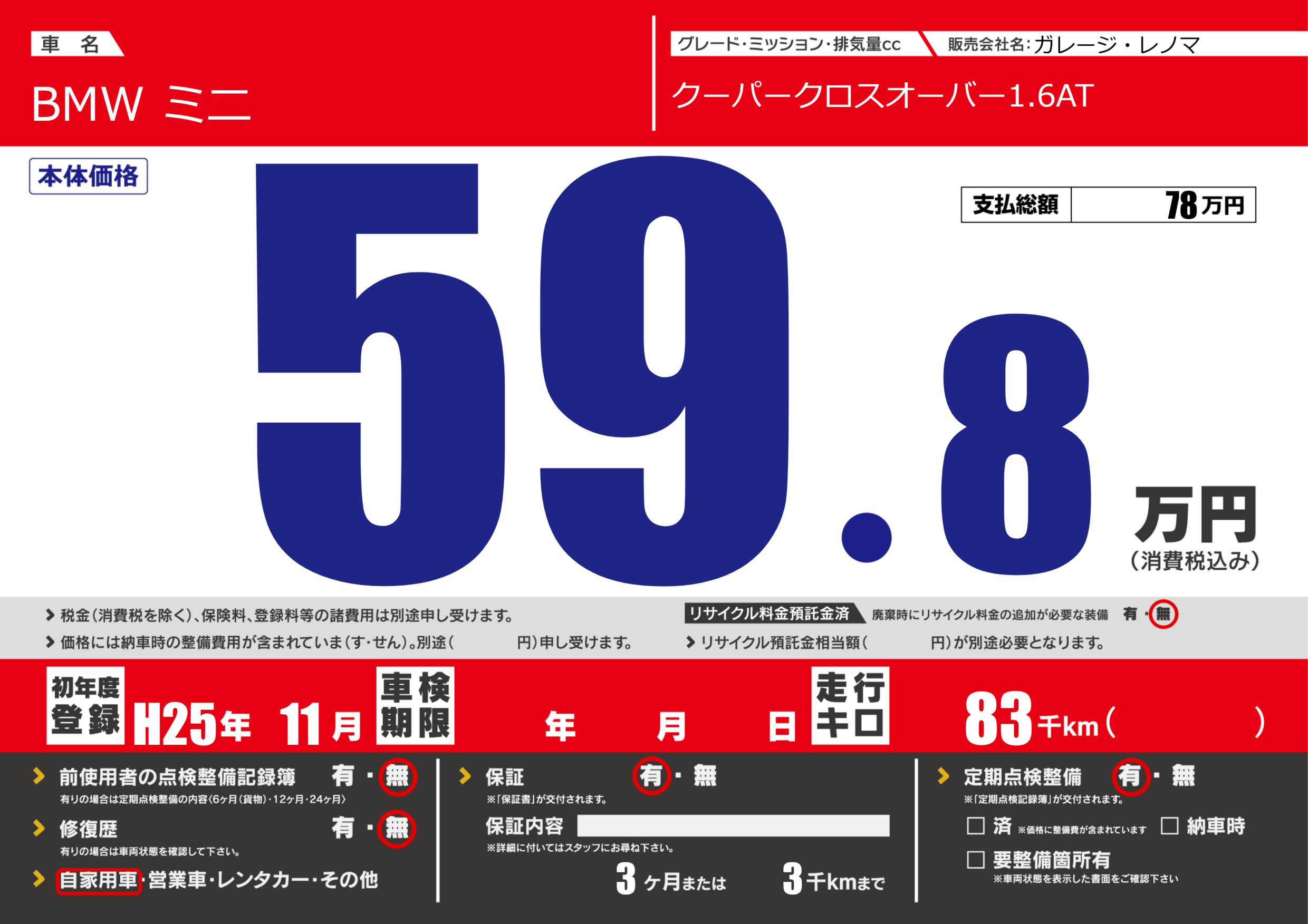 | 車名 | BMW ミニ | グレード ミッション 排気量 |