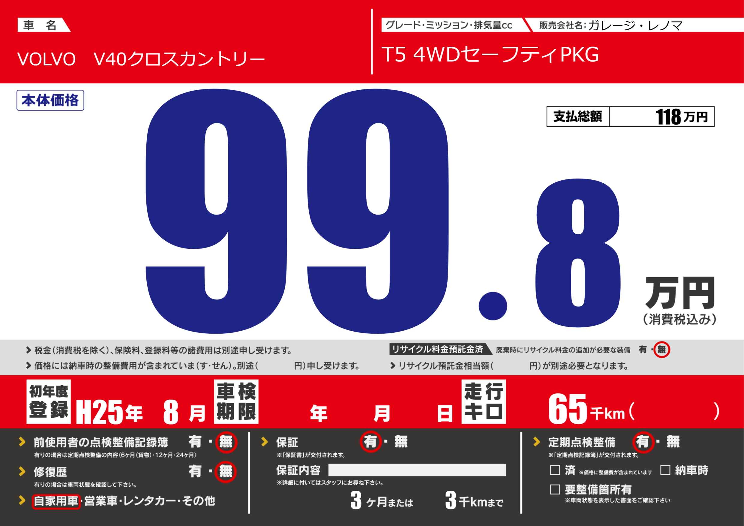 | 車名 | VOLVO V40クロスカントリー | グレード ミッション 排気量 |