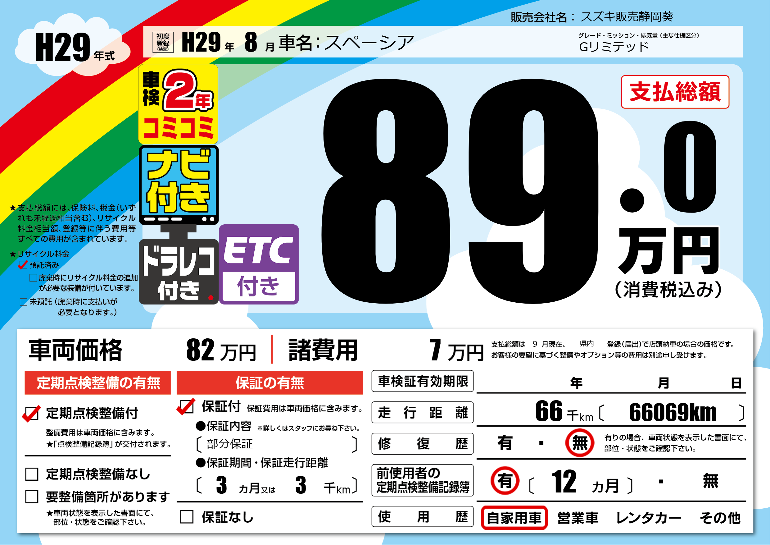 | 走行キロ | 6.6万km | 初年度登録 | H29年8月 |