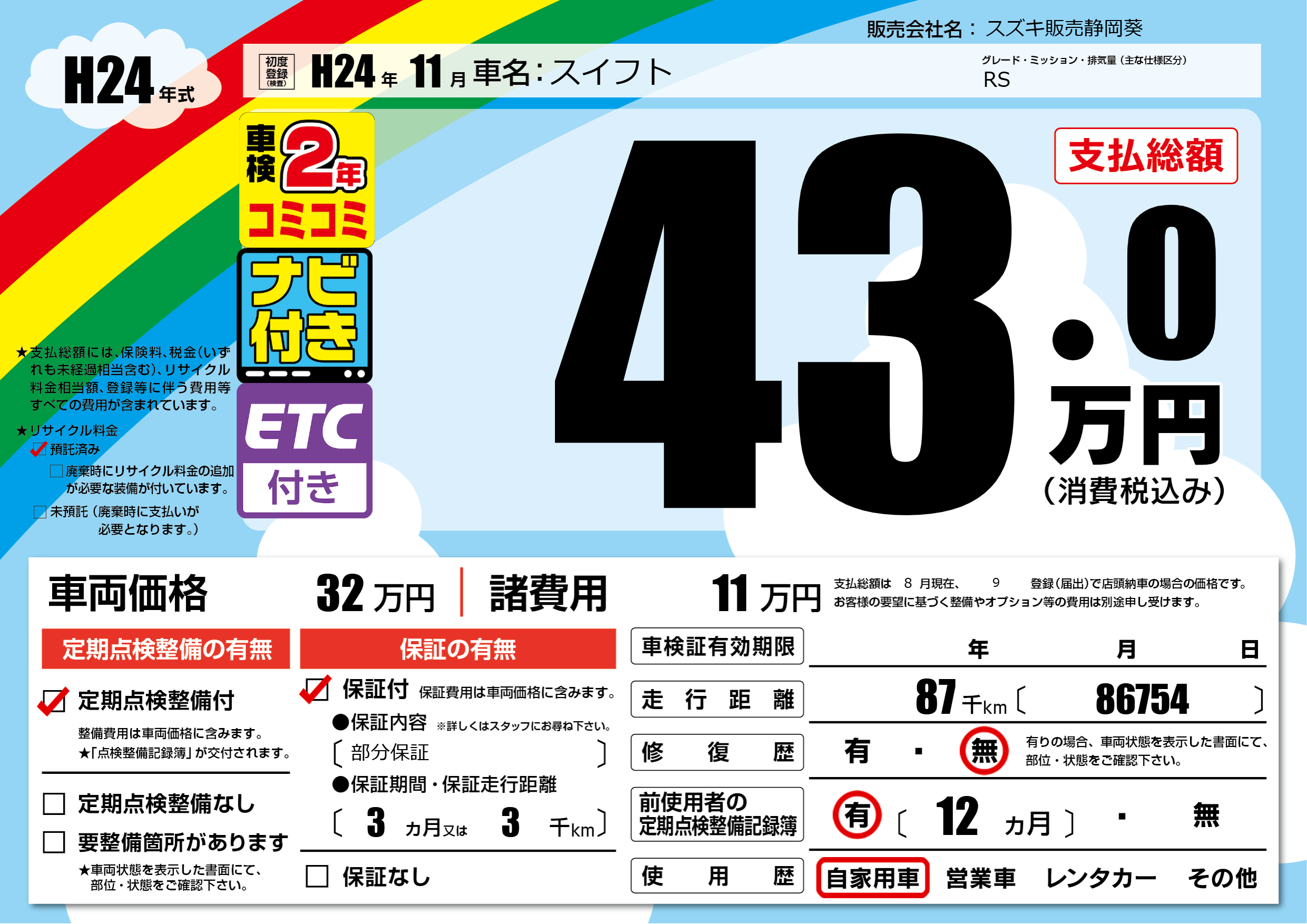 | 車名 | スイフト | グレード ミッション 排気量 |