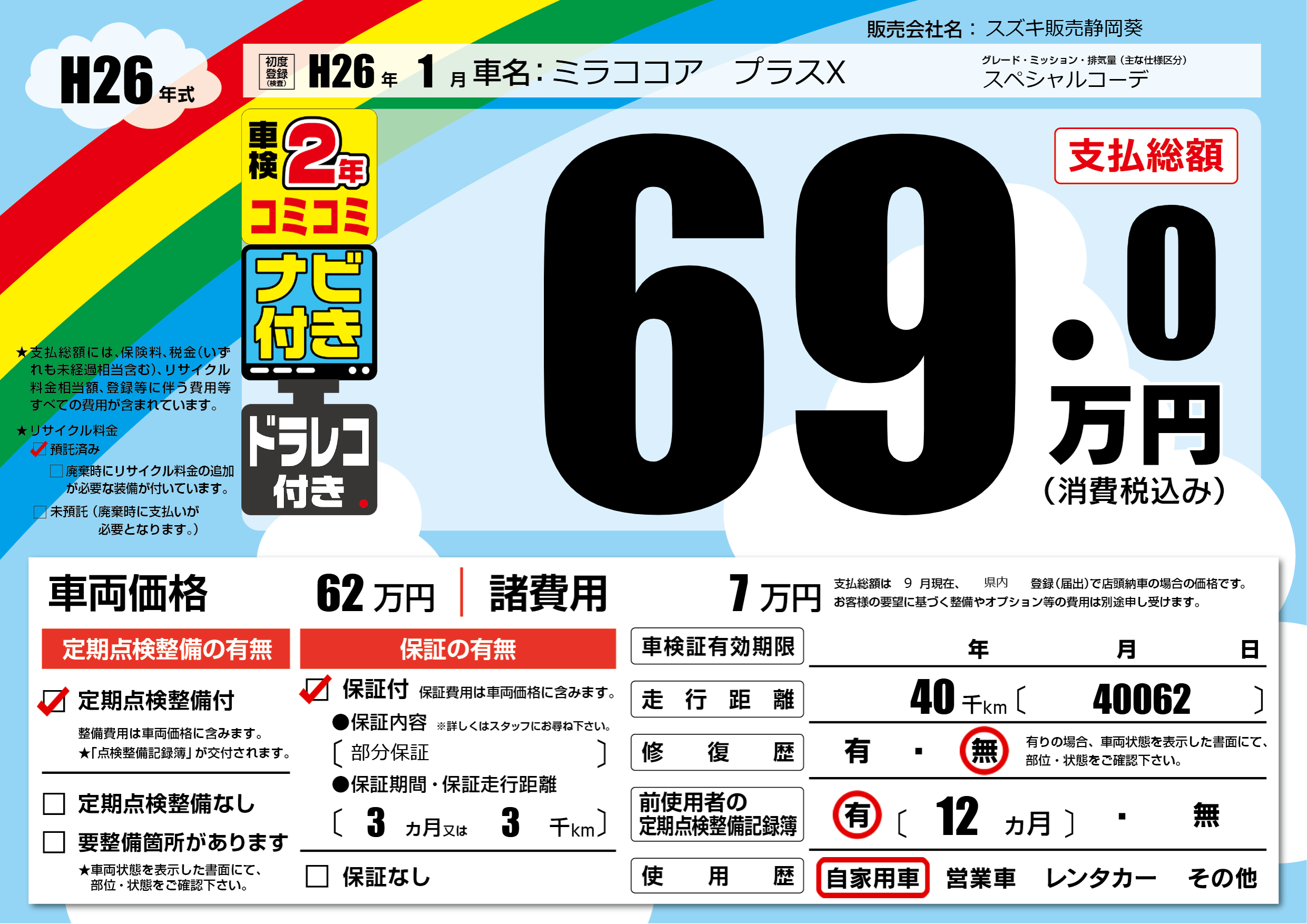 | 車名 | ミラココア プラスX | グレード ミッション 排気量 |