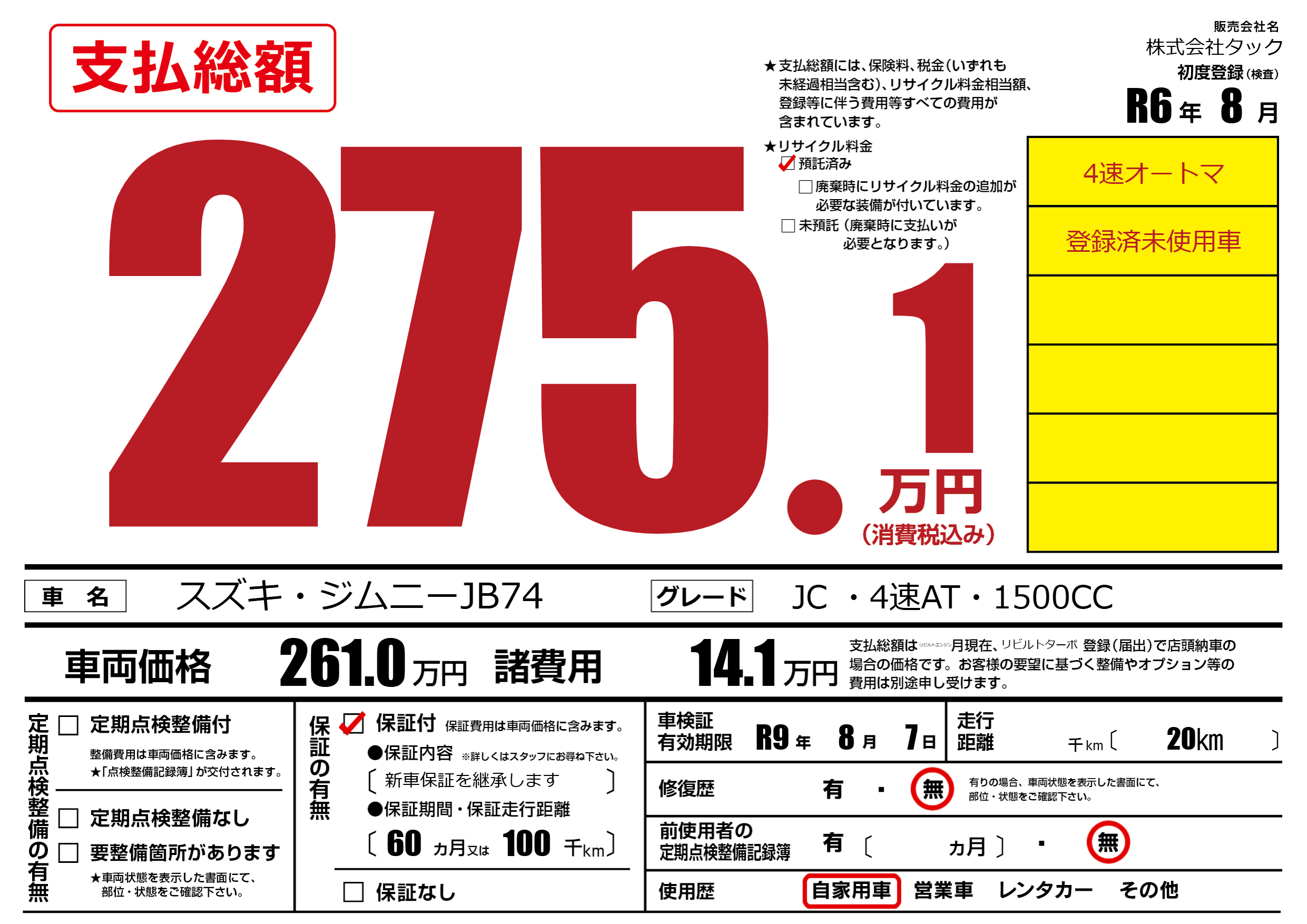 | 走行キロ | - | 初年度登録 | R6年8月 |