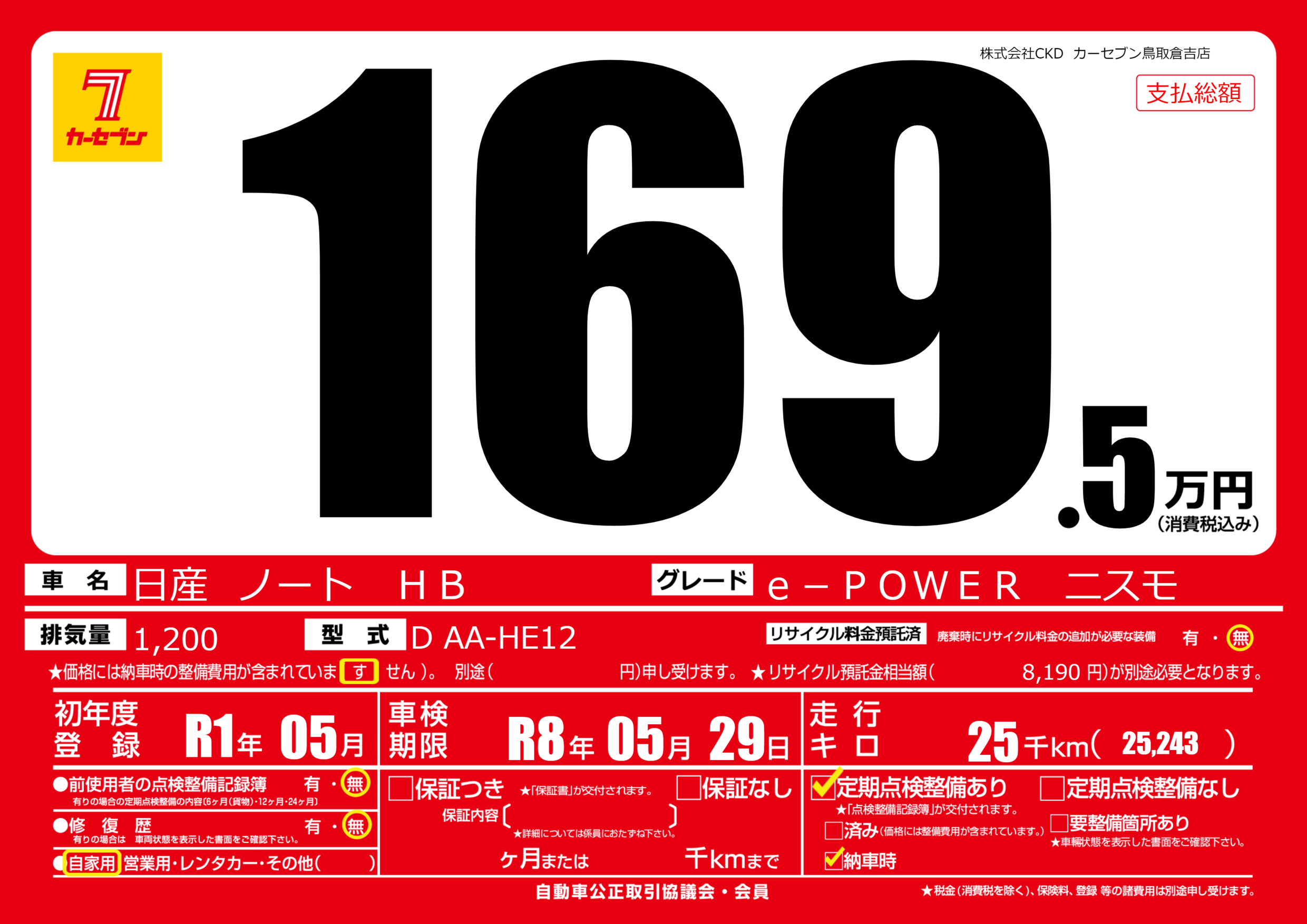 | 定期点検整備 | 定期点検整備あり 納車時あり | ||