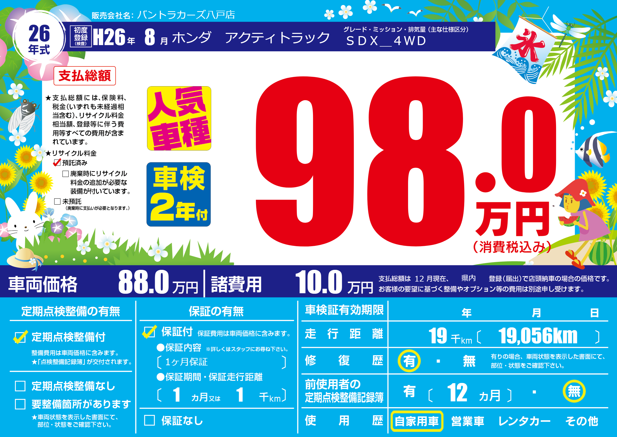 | 走行キロ | 1.9万km | 初年度登録 | H26年8月 |