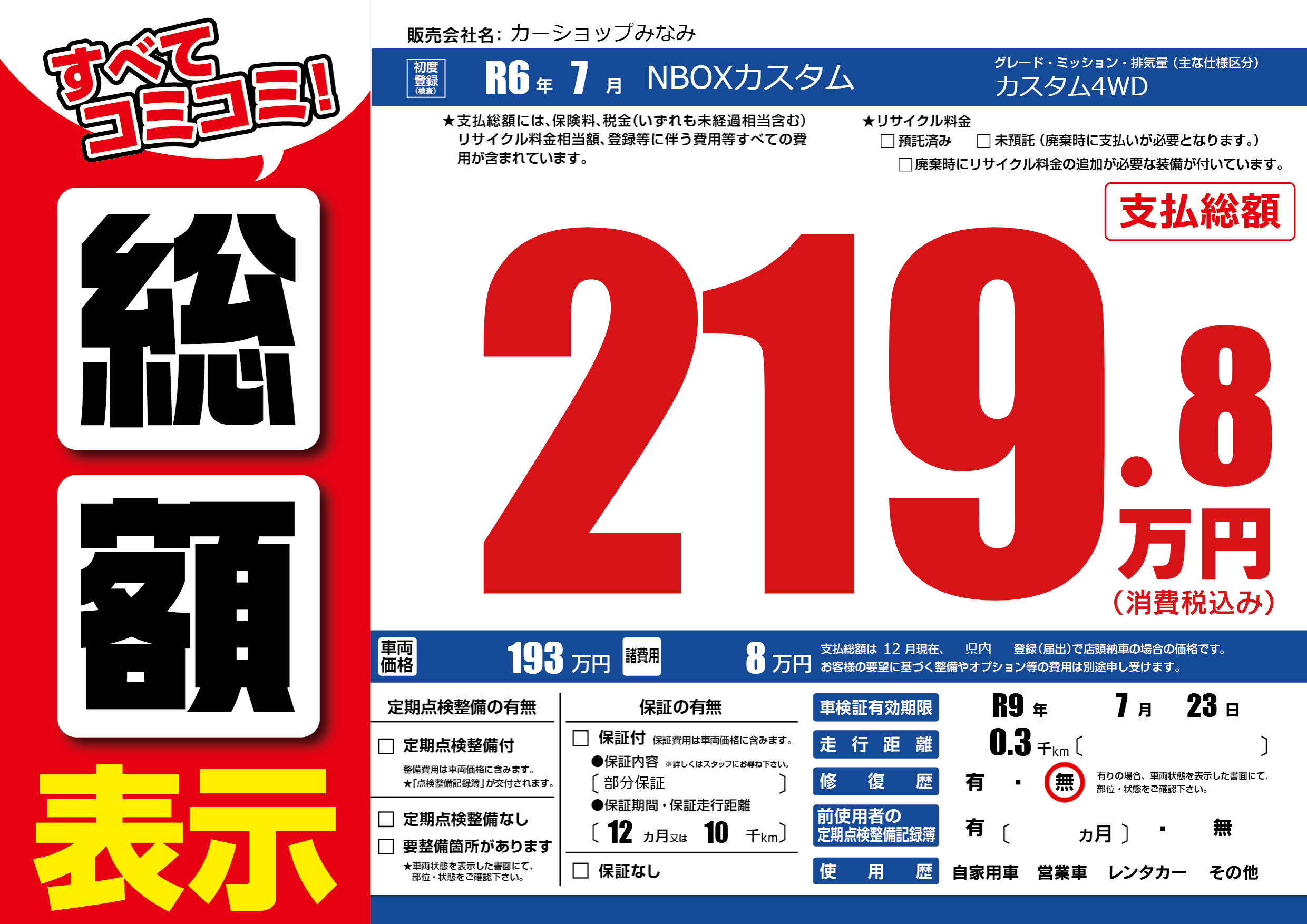 | 車名 | NBOXカスタム | グレード ミッション 排気量 |