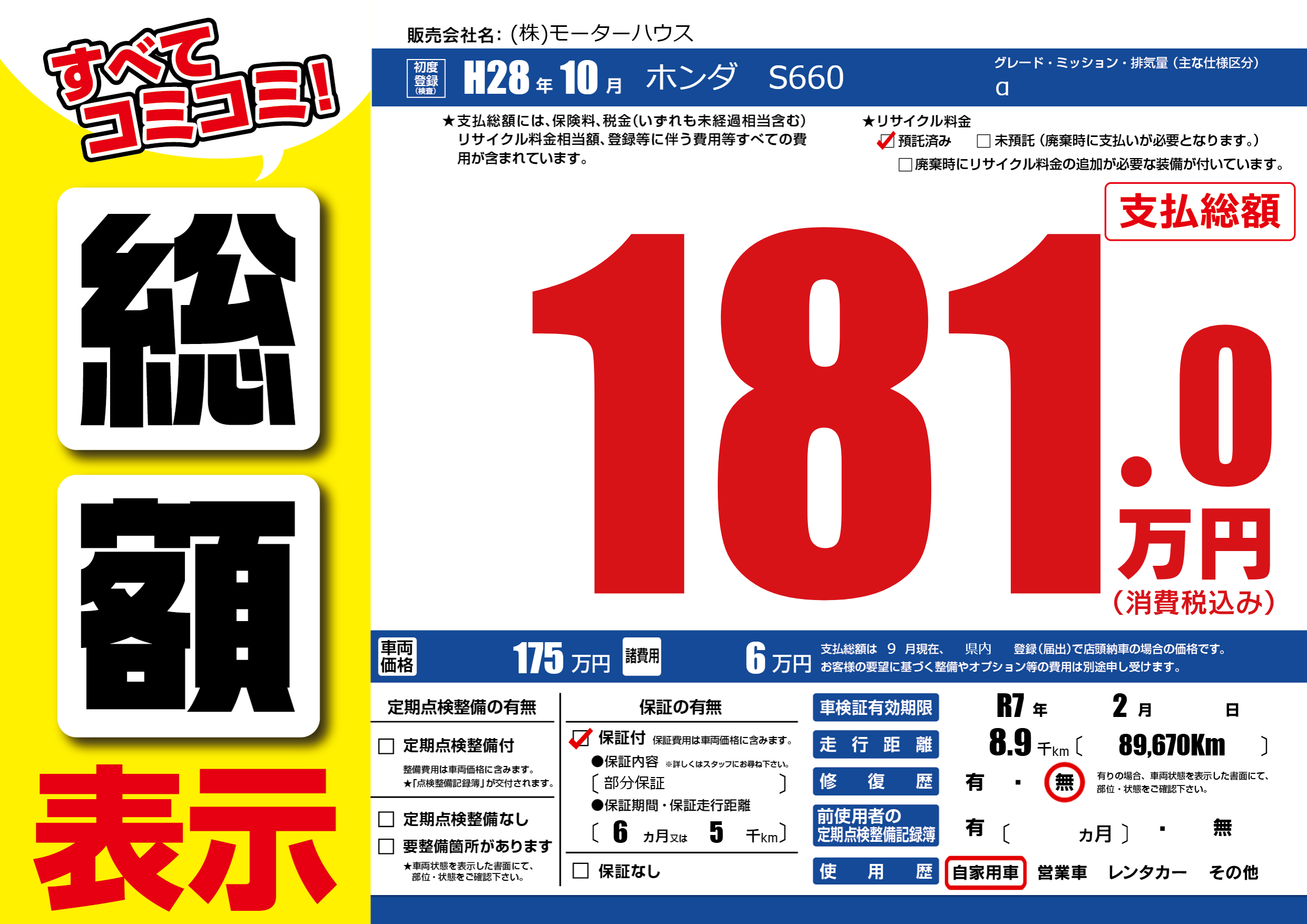 | 車名 | ホンダ S660 | グレード ミッション 排気量 |