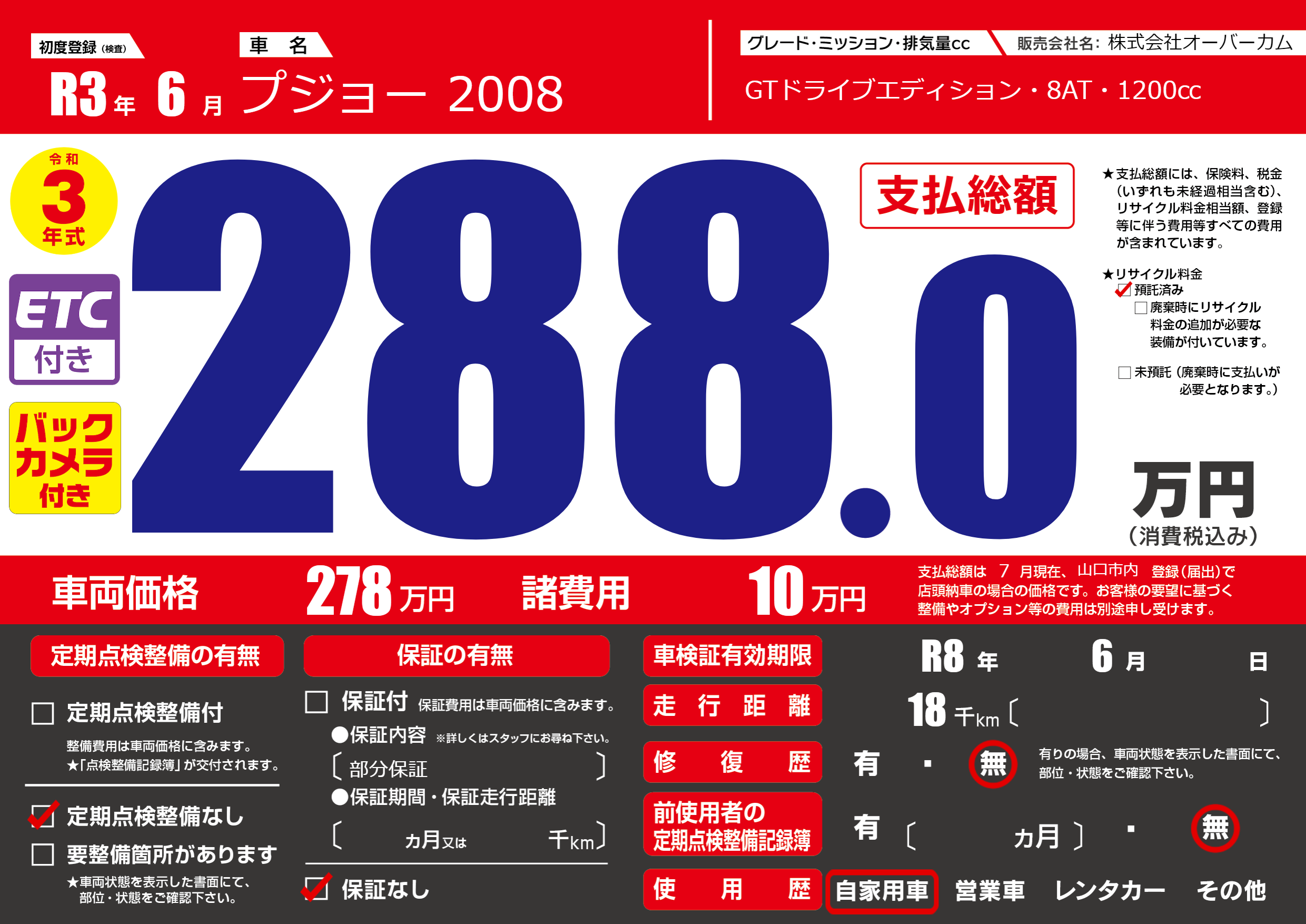 | 車名 | プジョー 2008 | グレード ミッション 排気量 |
