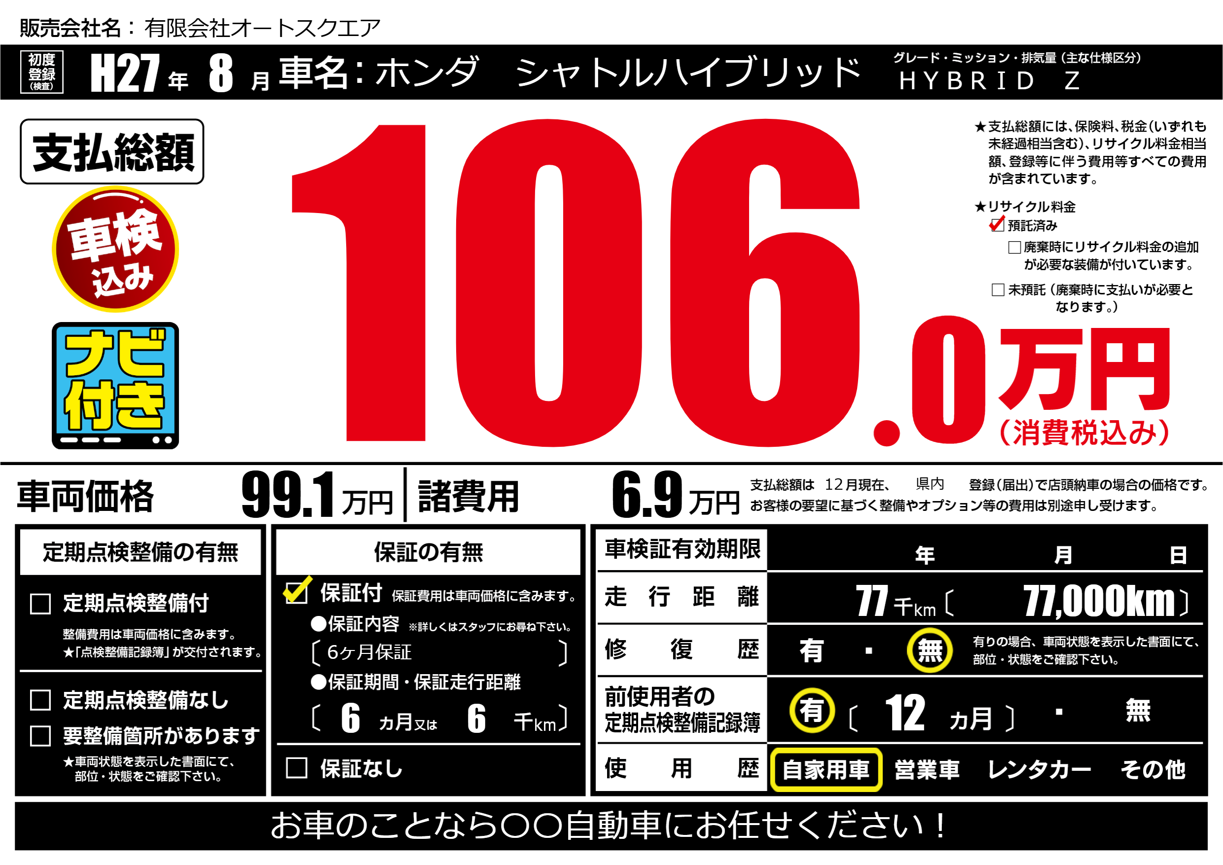 | 走行キロ | 7.7万km | 初年度登録 | H27年8月 |