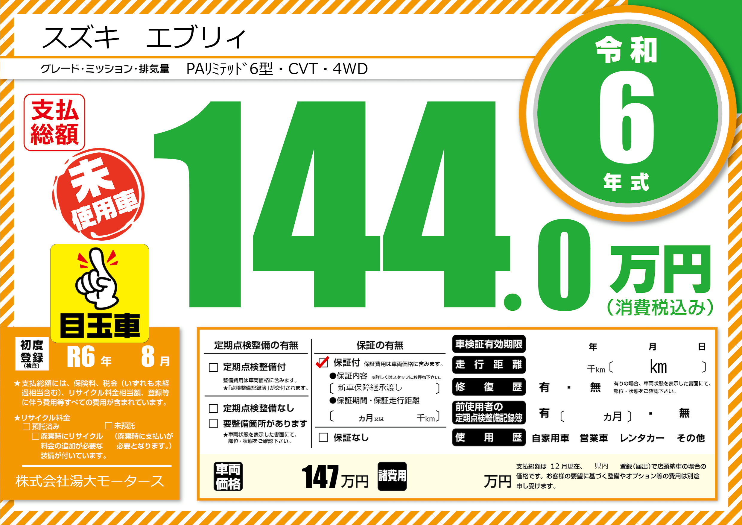 保証付き 保証内容(新車保障継承渡し) ---ヶ月または()千kmまで |