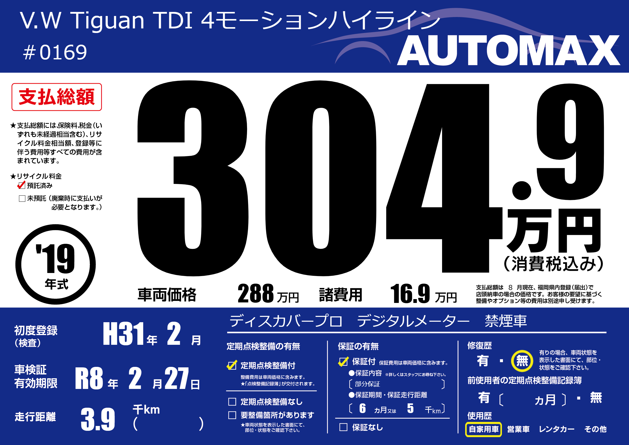 | 車名 | V.W Tiguan TDI 4モーションハイライン | グレード ミッション 排気量 |