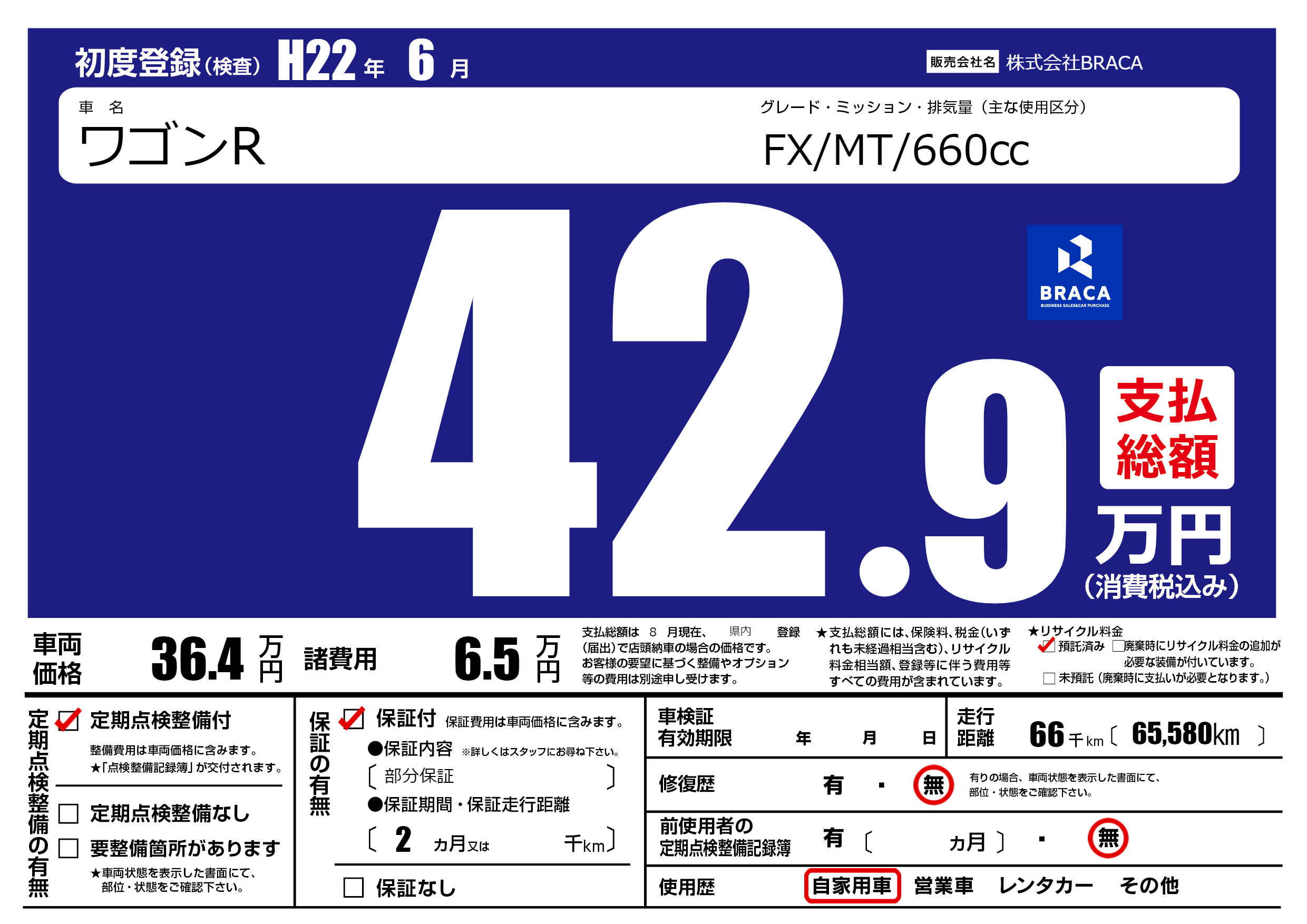 | 走行キロ | 6.6万km | 初年度登録 | H22年6月 |