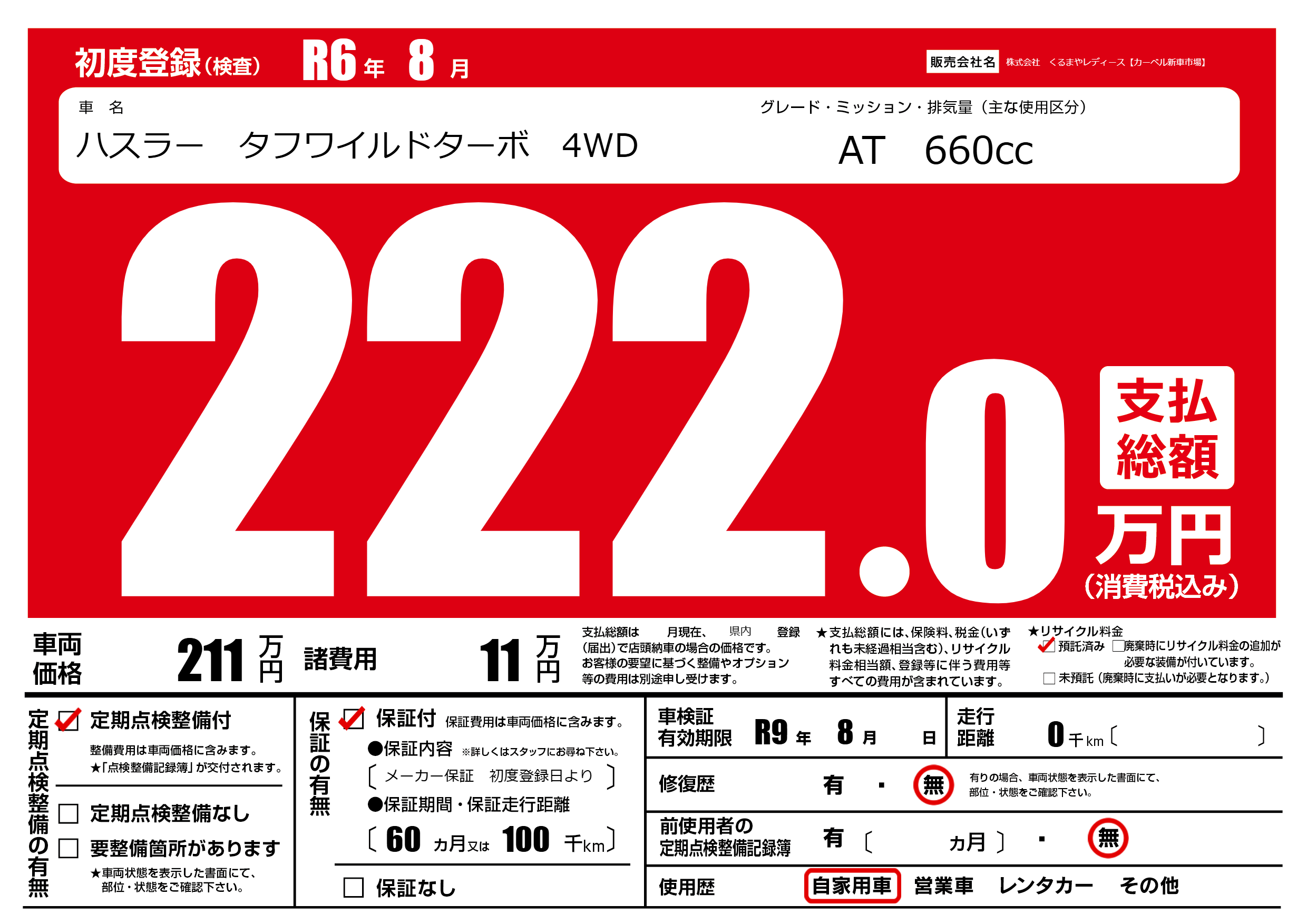 | 車名 | ハスラー タフワイルドターボ 4WD | グレード ミッション 排気量 |