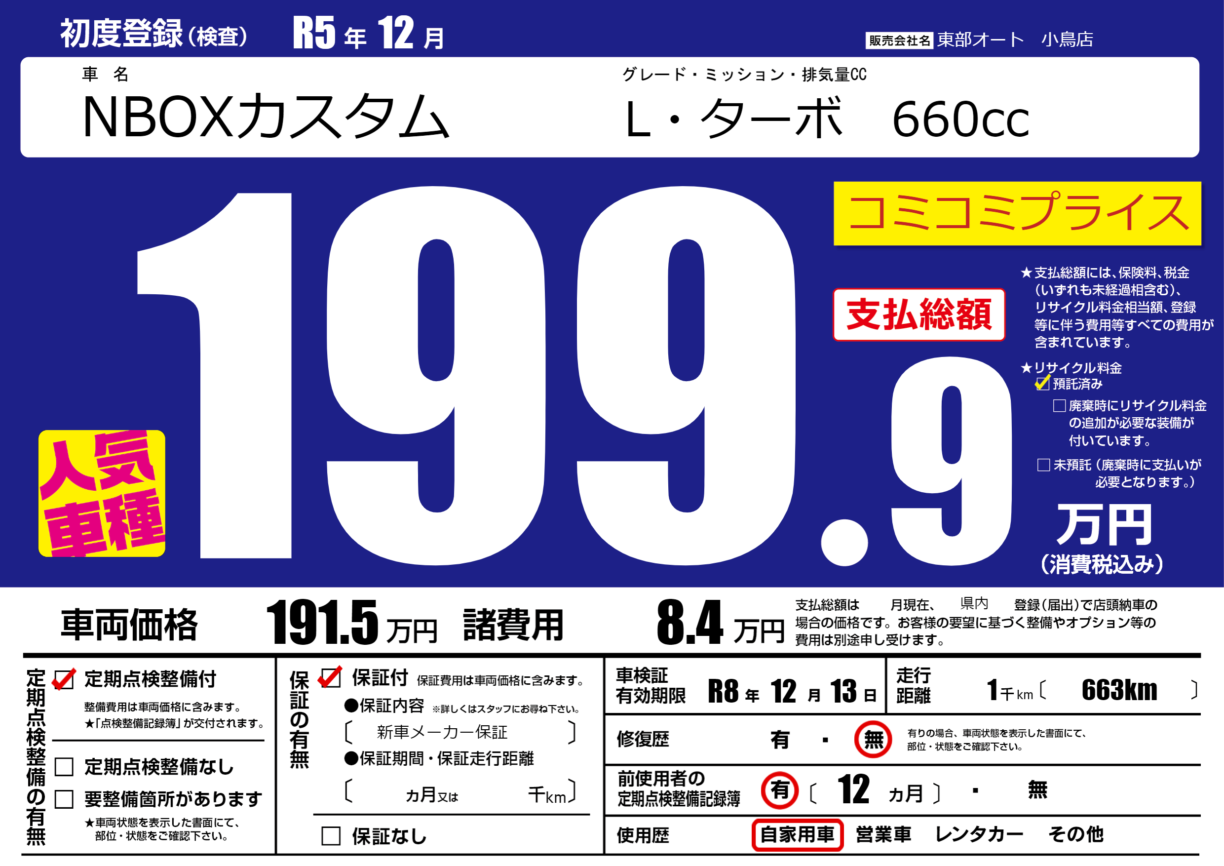 | 車検制限 | R8年 12月 13日 | ||