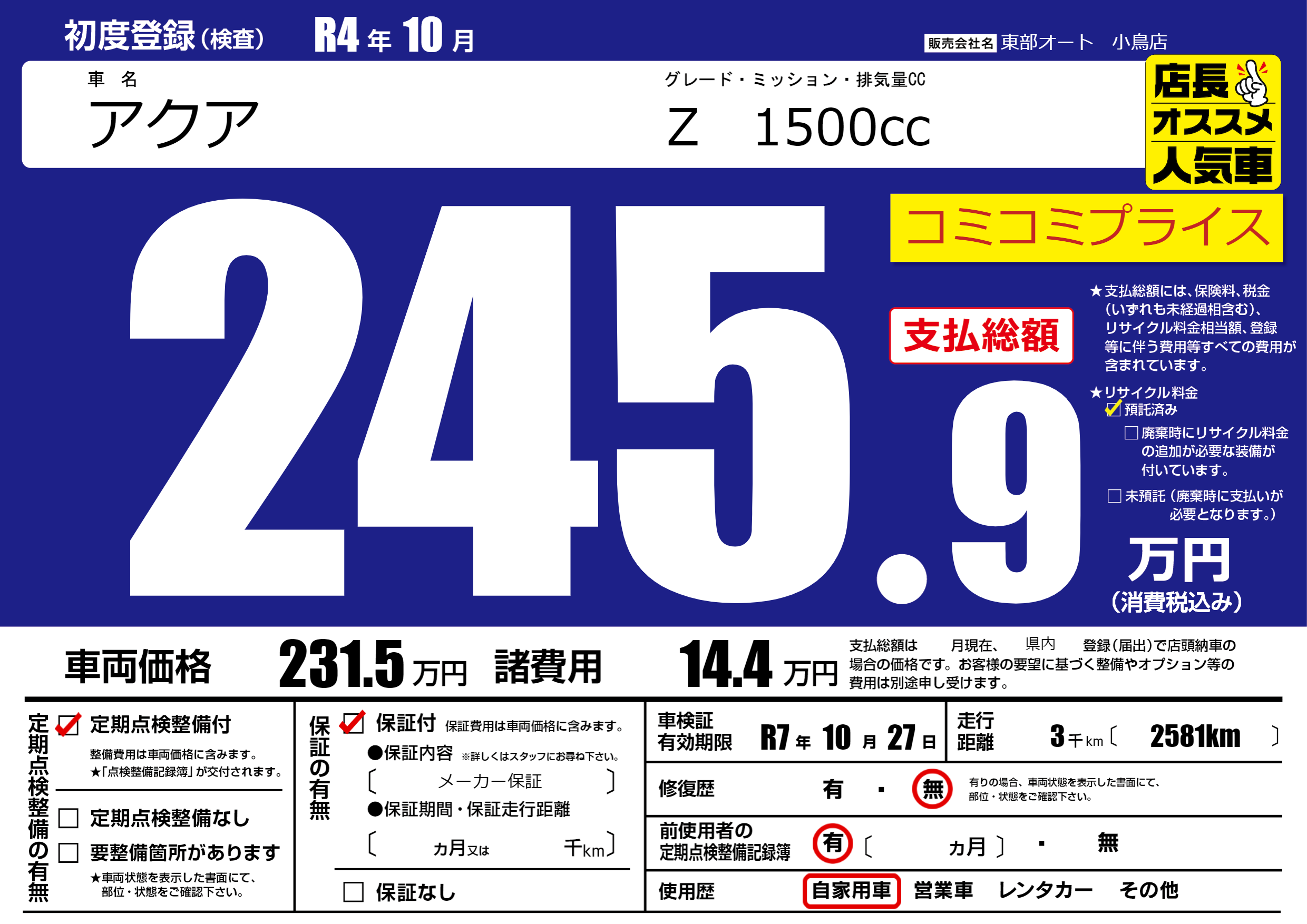 | 車検制限 | R7年 10月 27日 | ||
