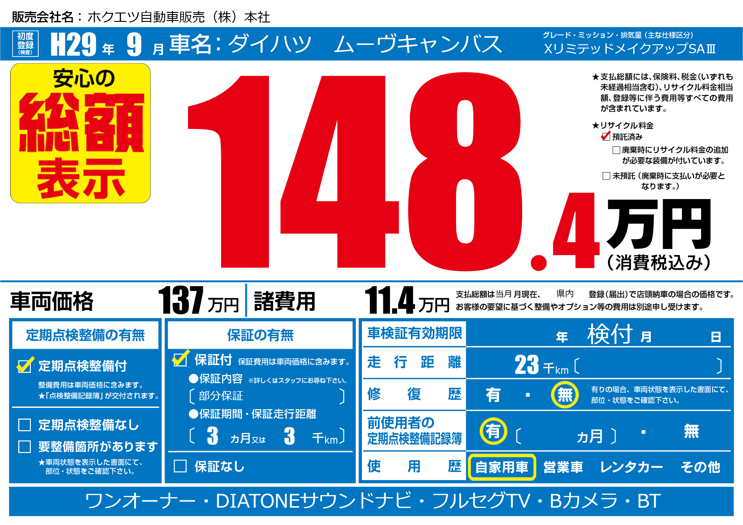 | 走行キロ | 2.3万km | 初年度登録 | H29年9月 |