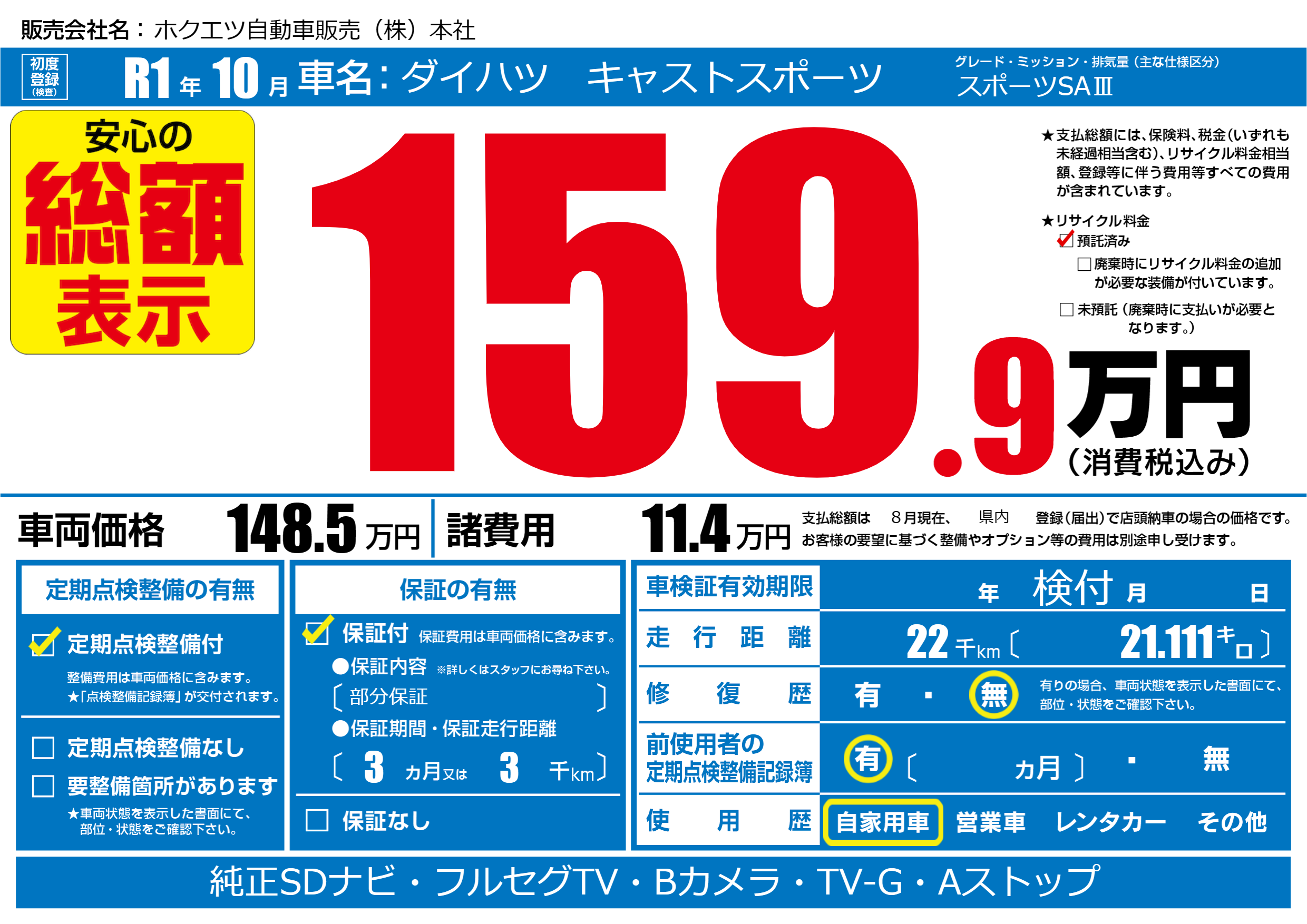 | 走行キロ | 2.2万km | 初年度登録 | R1年10月 |