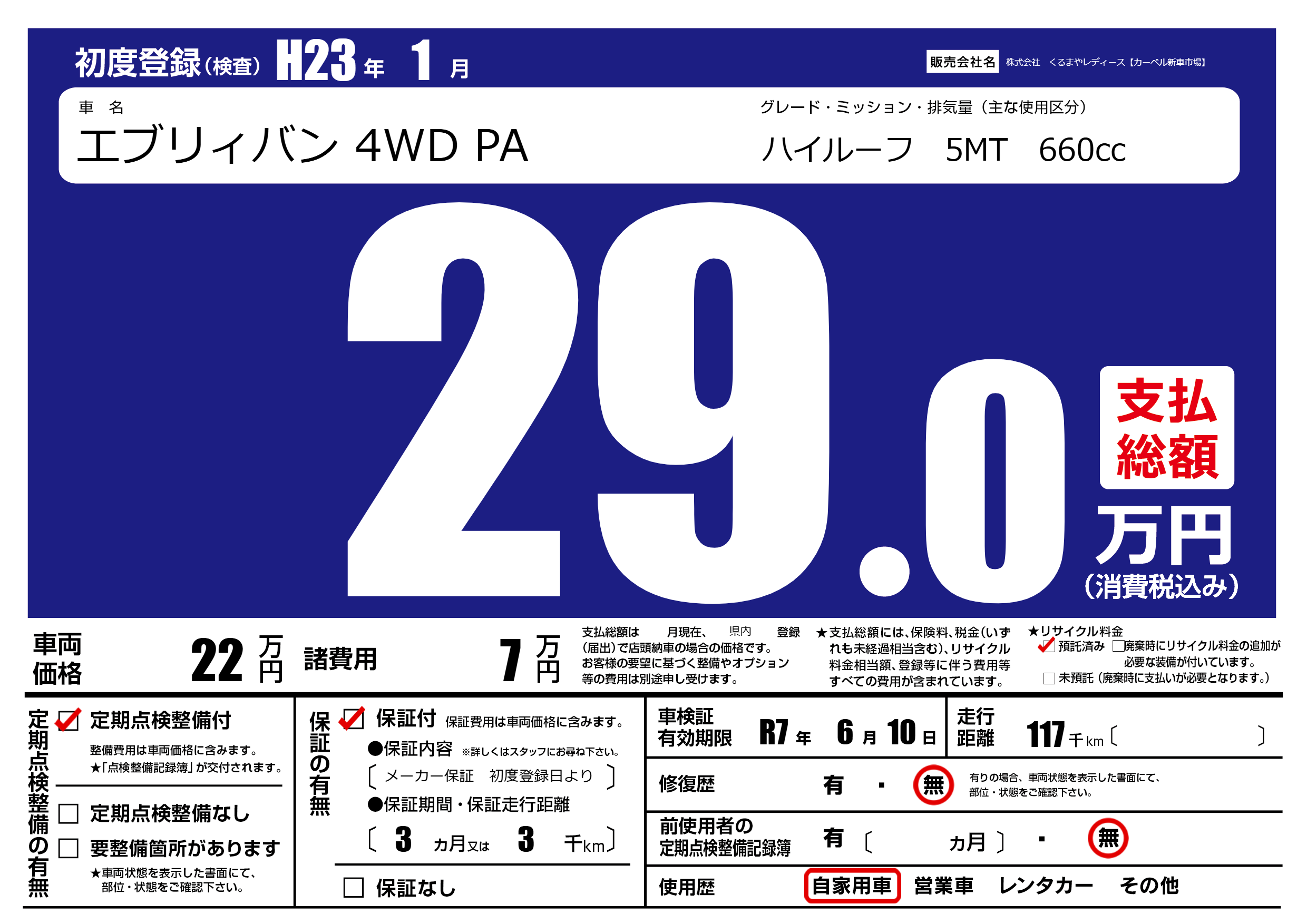 | 車名 | エブリィバン 4WD PA | グレード ミッション 排気量 |
