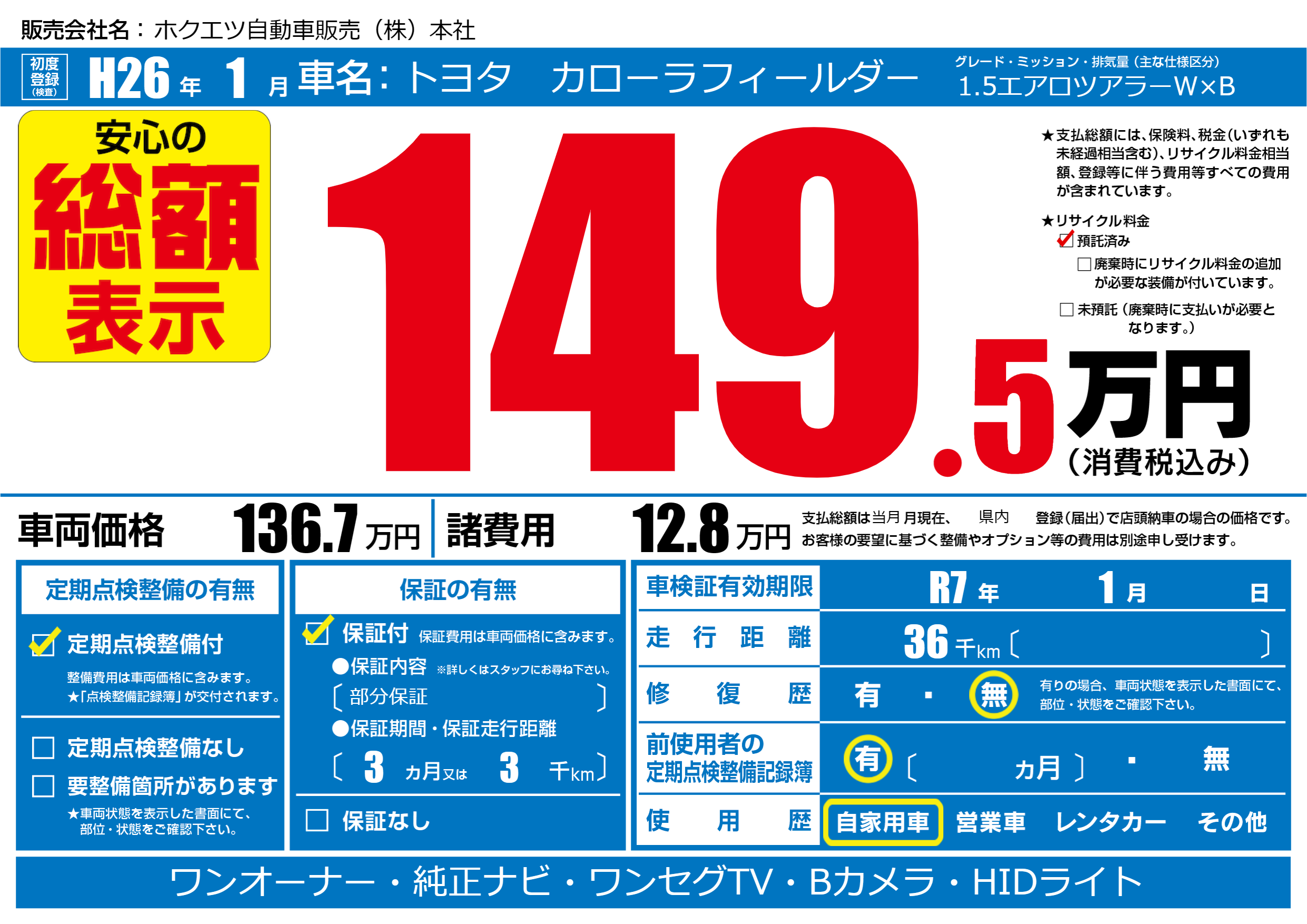 | 車名 | トヨタ カローラフィールダー | グレード ミッション 排気量 |
