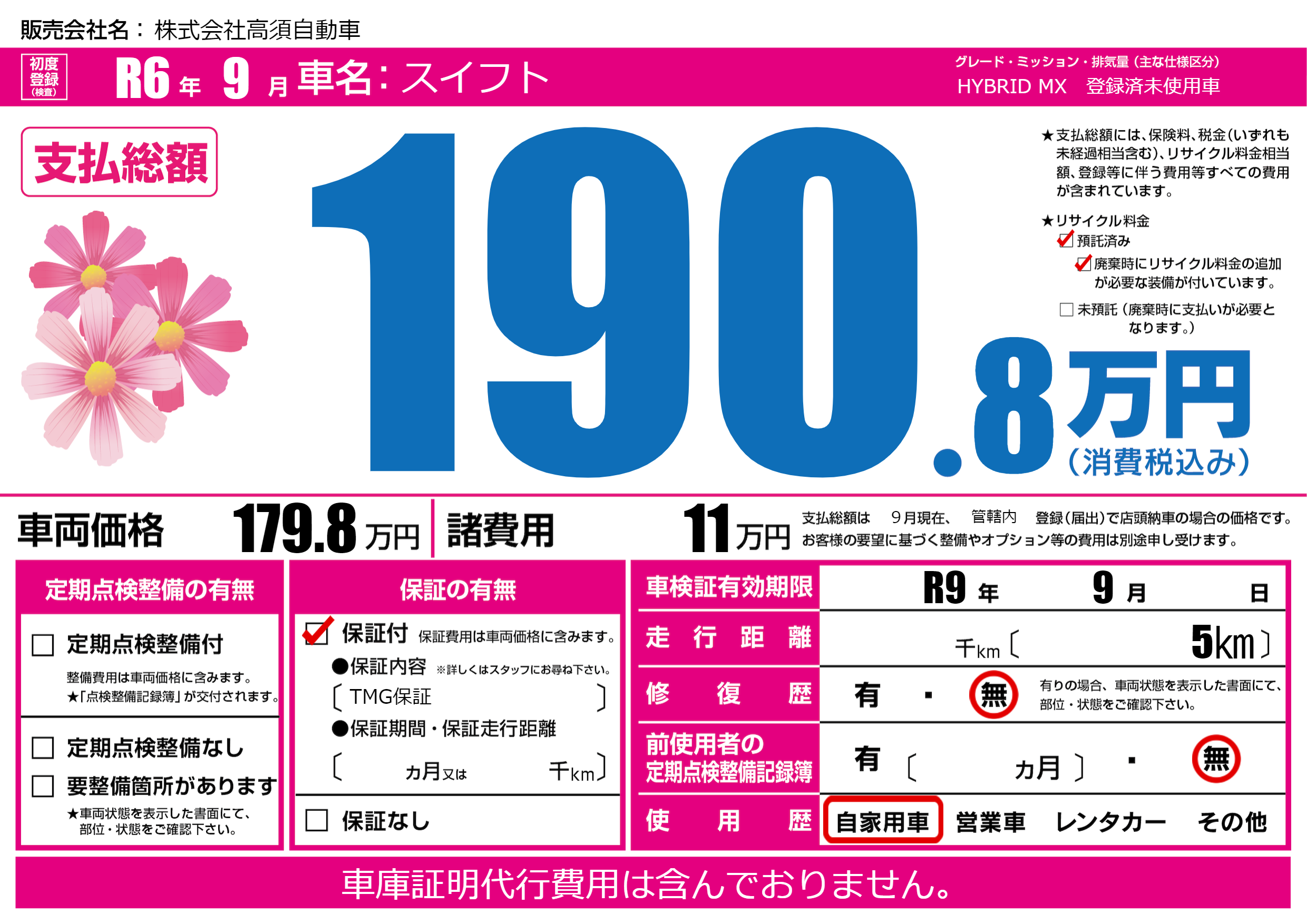 | 車検制限 | R9年 9月 - 日 | ||