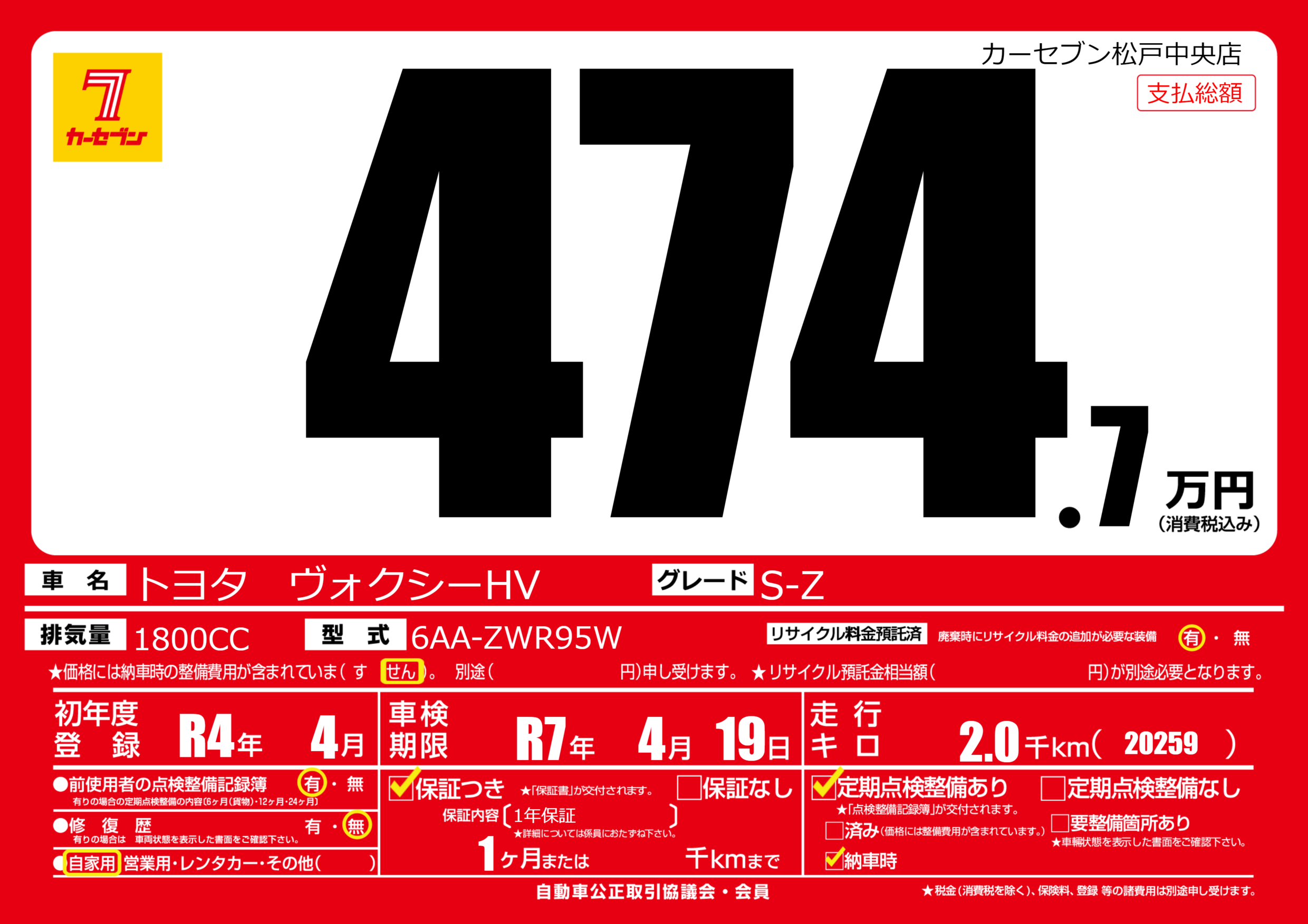 | 車名 | トヨタ ヴォクシーHV | グレード ミッション 排気量 |