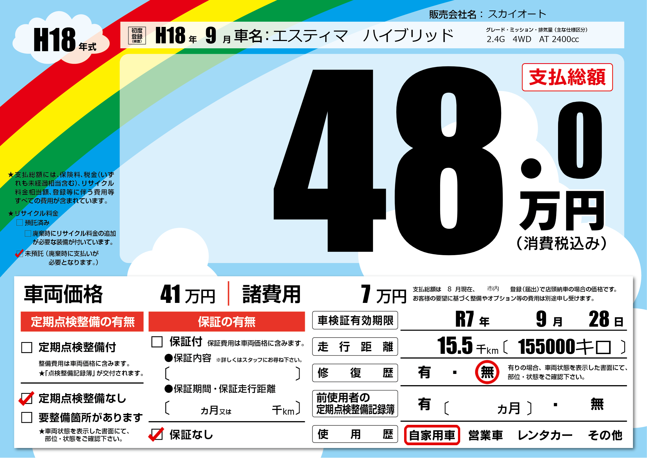 | 車名 | エスティマ ハイブリッド | グレード ミッション 排気量 |