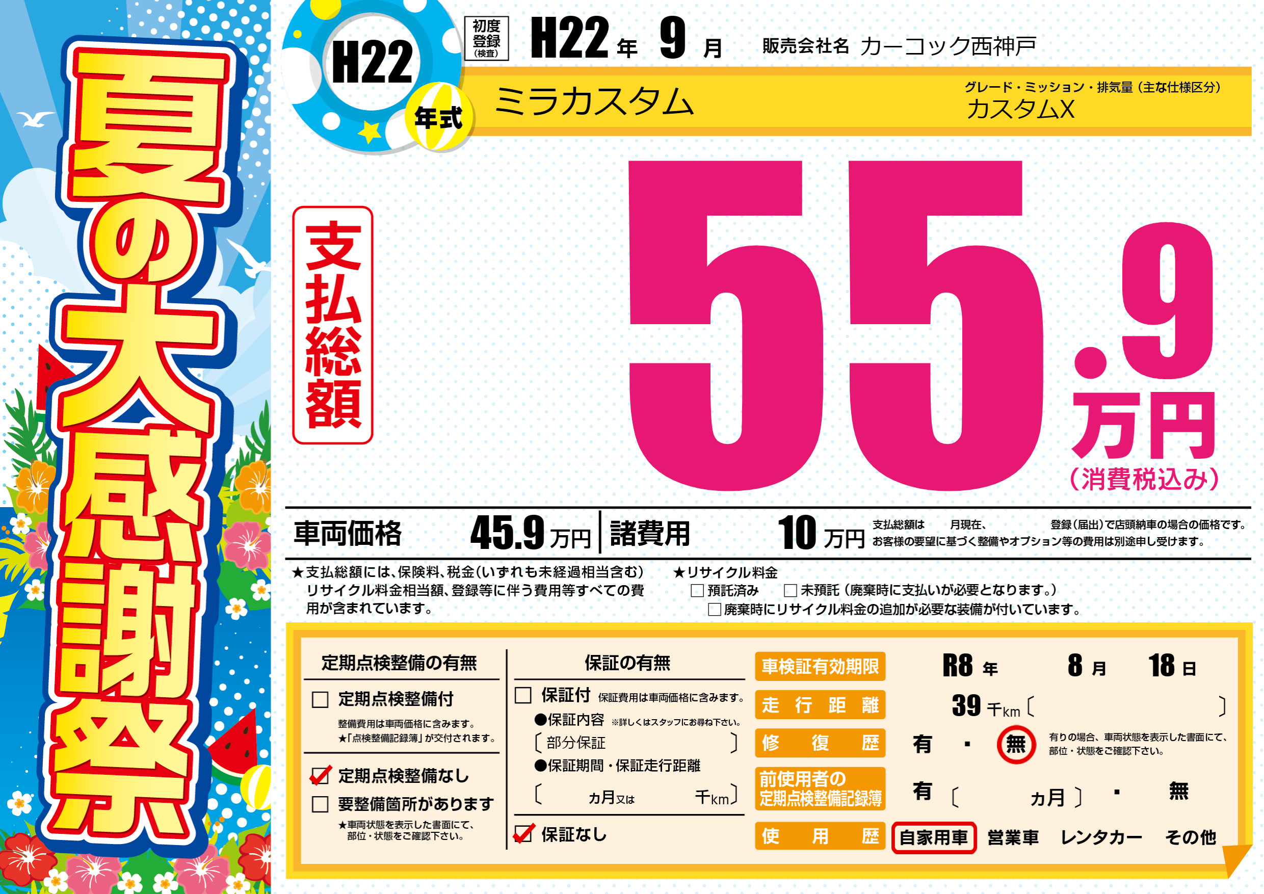 | 走行キロ | 3.9万km | 初年度登録 | H22年9月 |