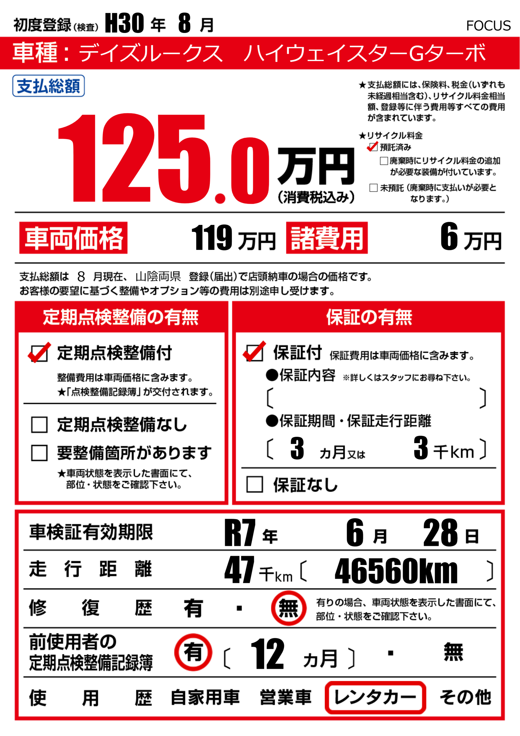 なし | 車検制限 | R7年6月28月 |